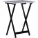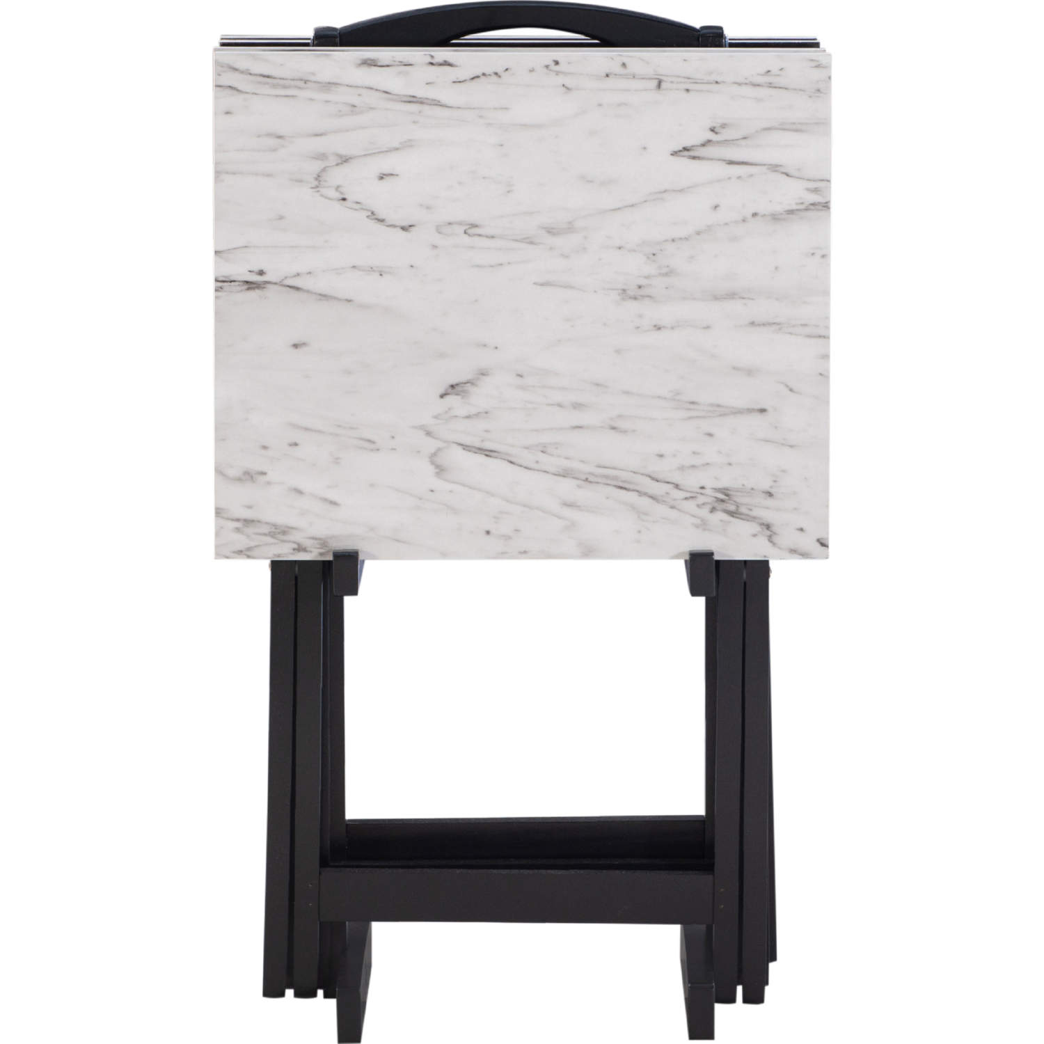 The White Faux Marble TV Tray Set has a distinctive look with its sturdy wood construction and faux white marble top. This five piece set includes four foldable TV trays and one storage stand. The handle on the top of the black finished stand makes it easy to transport the entire set from one room to another. A classic home furnishings staple.