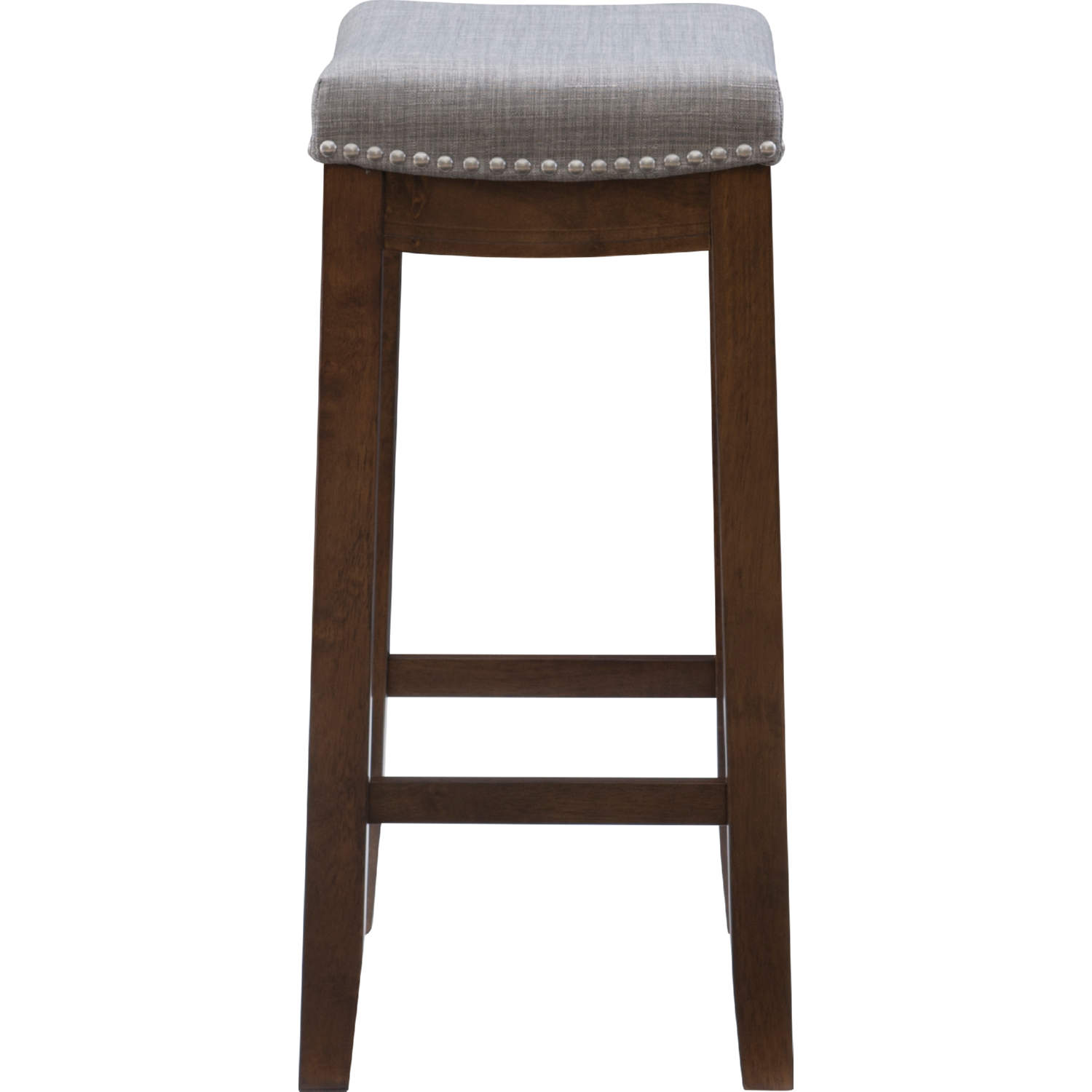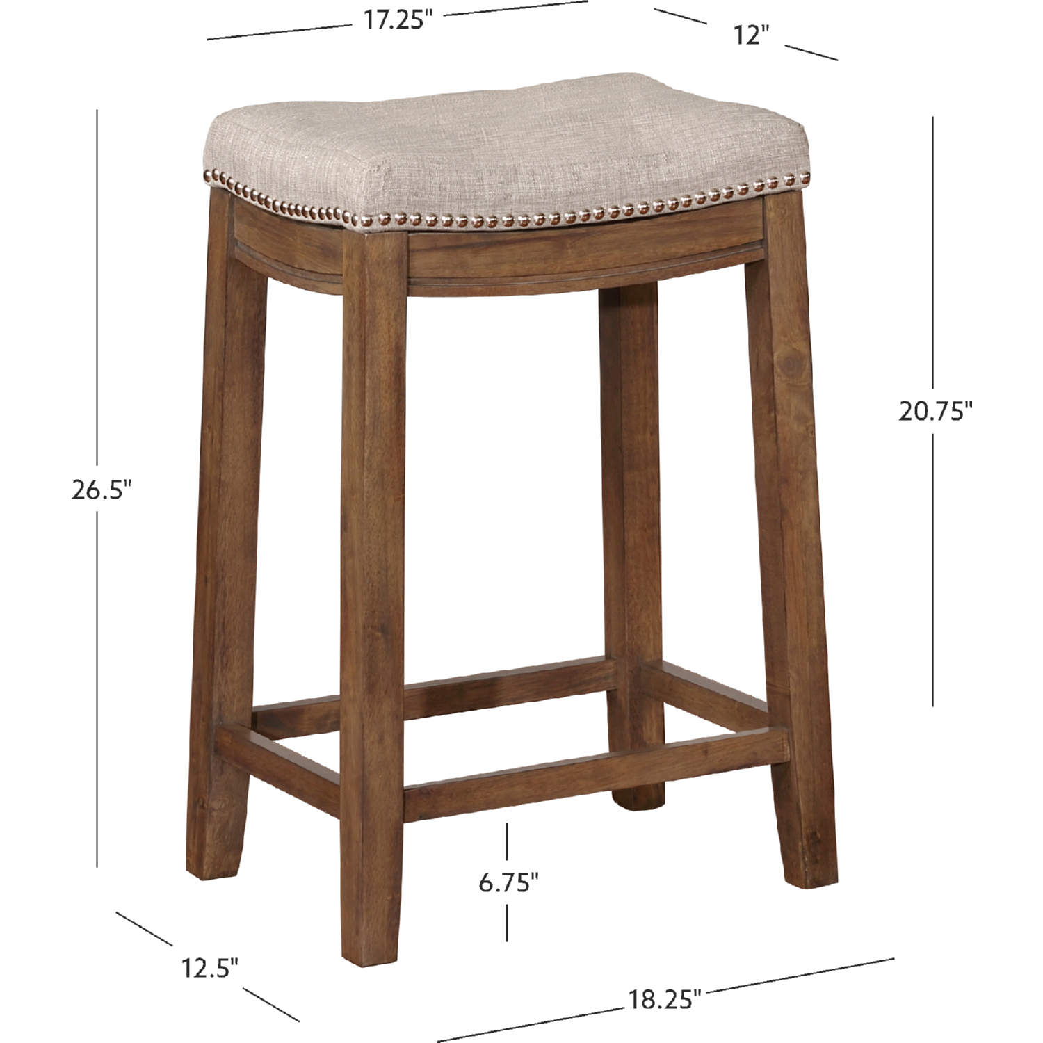 This Counter Stool will add stylish seating to any counter or high top table in your home. The sturdy wood frame has a rustic finish accented by a gray linen weave polyester upholstered seat. Brushed silver nailhead trim adds an eye catching detail. 26" Seat Height. 275 pound weight limit.