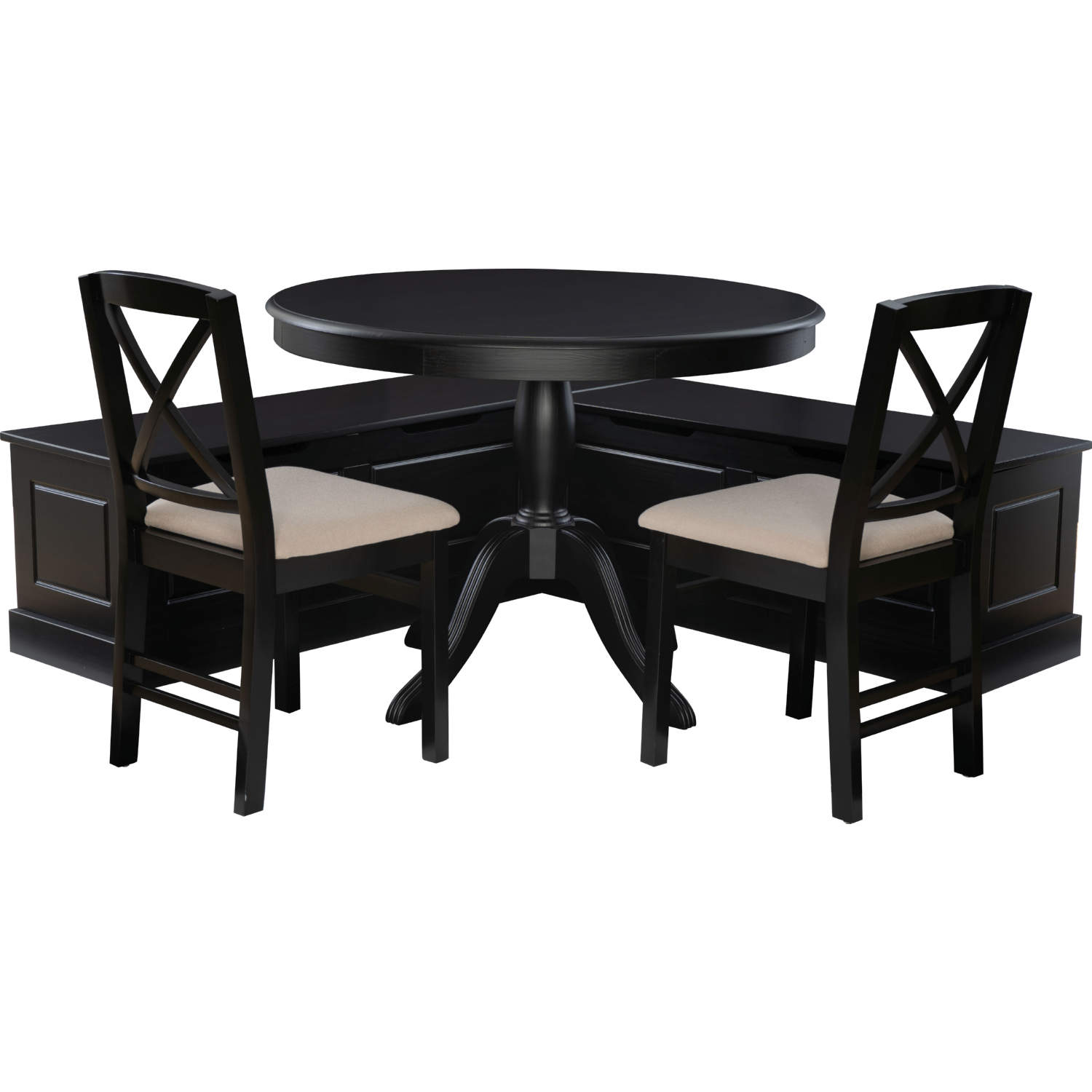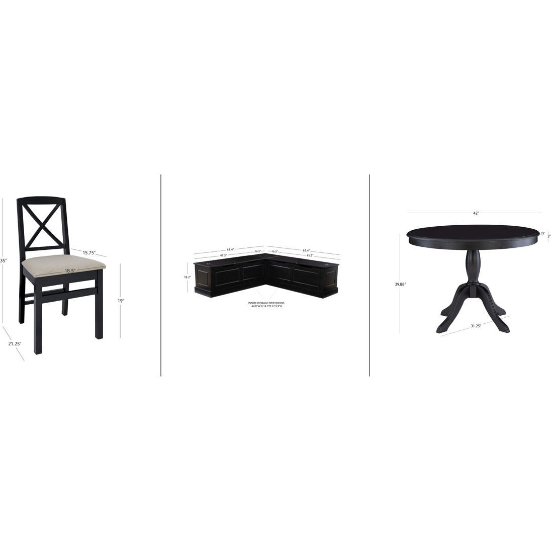 • Four piece set includes: dining nook, round dining table, and two dining chairs