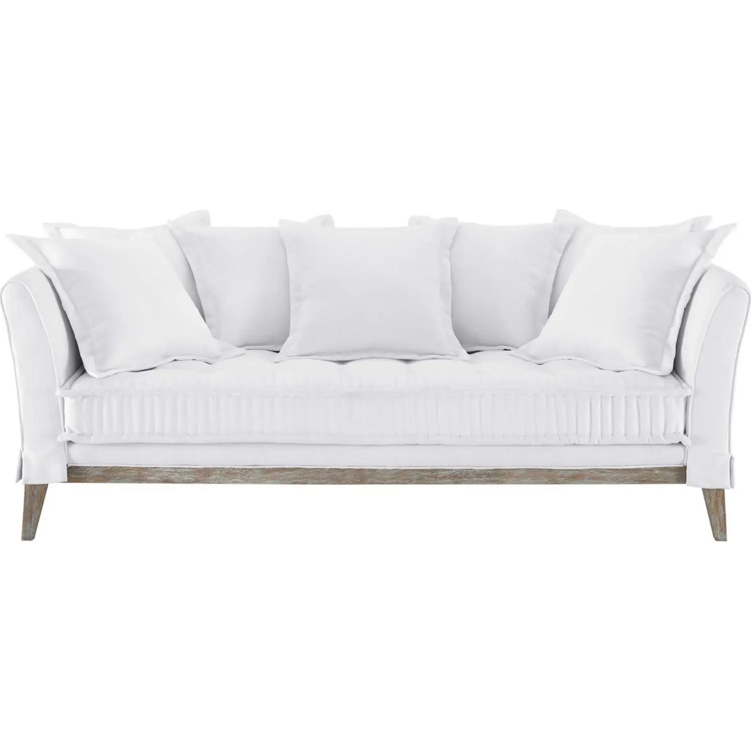 Inspire calming comfort and relaxed style in your living space with the Rowan Fabric Sofa. Inviting guests to sit and stay for a while, this living room sofa features a casual yet tailored design brimming with modern farmhouse charm. Resting atop a sturdy wood frame with rustic distressing, this sofa grants a premium seating experience thanks to its soft fabric upholstery, seven throw pillows, and dense foam padding. Shipping directly to your doorstep, this sofa modernizes the traditional furniture shopping experience. Sofa Weight Capacity: 1322 lbs.
