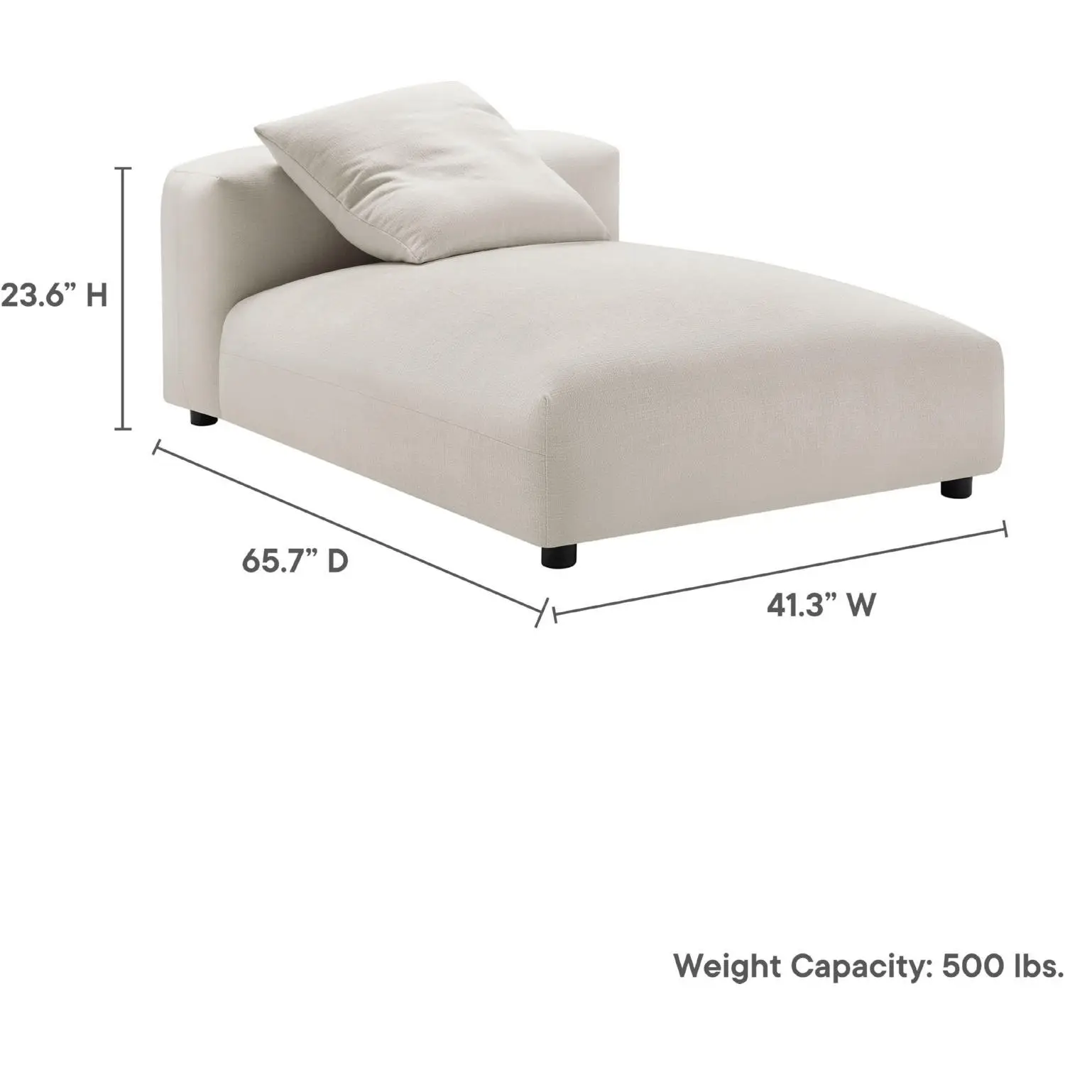 Dimensions: Overall: 65.75"D x 41.34"W x 23.62"H, Seat: 51.58"D x 41.34"W x 15.36"H, Backrest: 14.18"D x 41.34"W x 8.66"H, Leg: 2.36"D x 2.36"W x "H, Pillow: "D x 22.84"W x 22.44"H