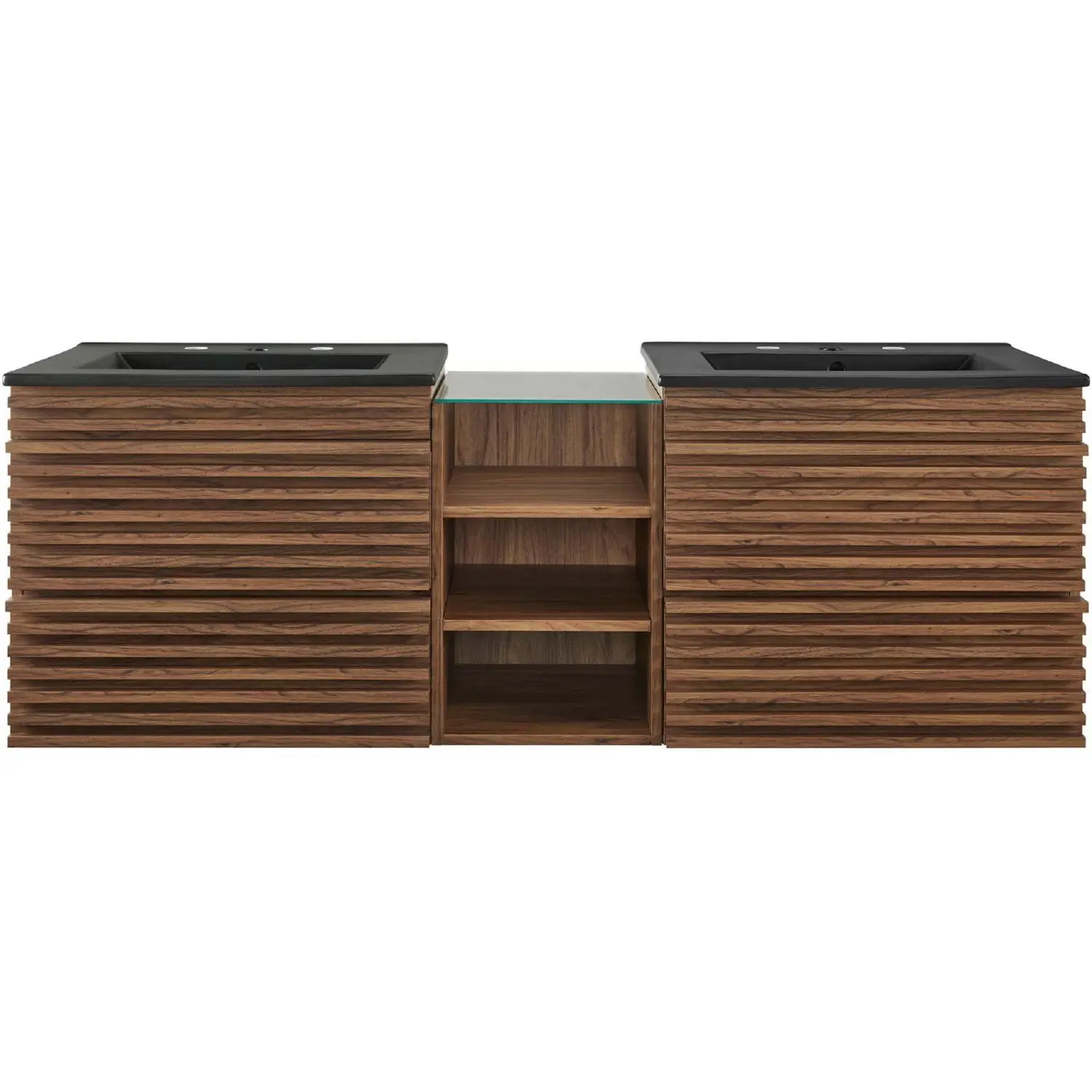 Modway EEI-6941-WAL-BLK Render 62" Wall Mount Double Sink Bathroom Vanity Walnut Glass Black Ceramic