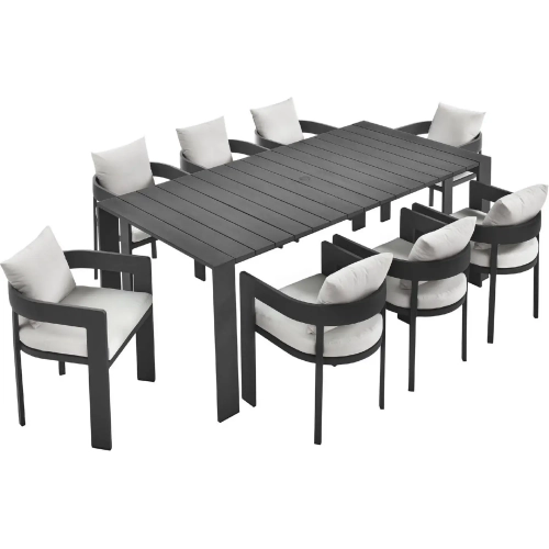 • 9 piece patio dining set includes: Dining table and eight chairsPowder coated Aluminum