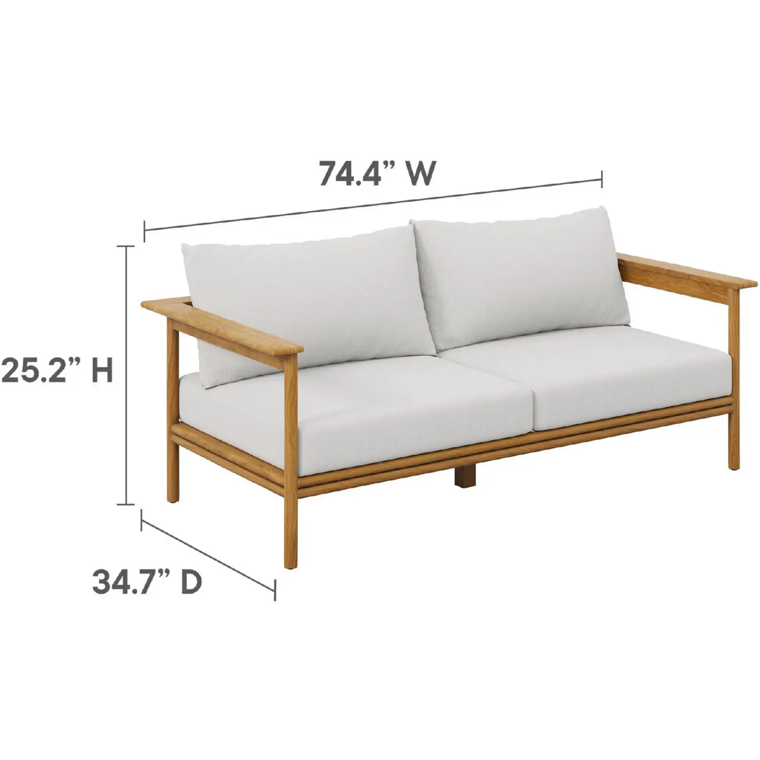 Dimensions: Outdoor Sofa: 34.65"D x 74.41"W x 25.2"H, Seat: 66.93"W x 31.50"D x 16.34"H, Outdoor Ottoman: 26.97"D x 33.07"W x 16.14"H