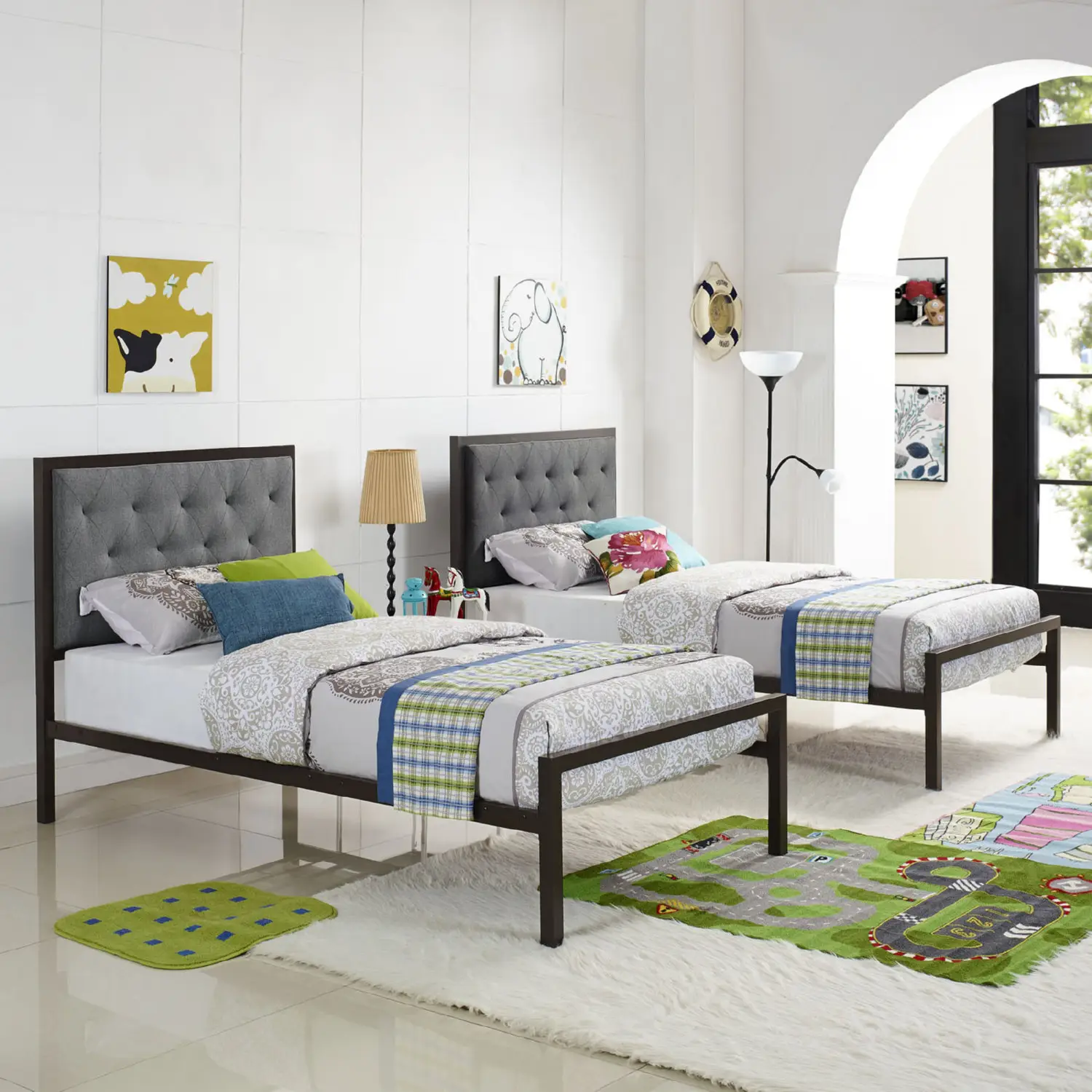 • One Mia Twin Tufted Brown Gray Fabric Platform Bed