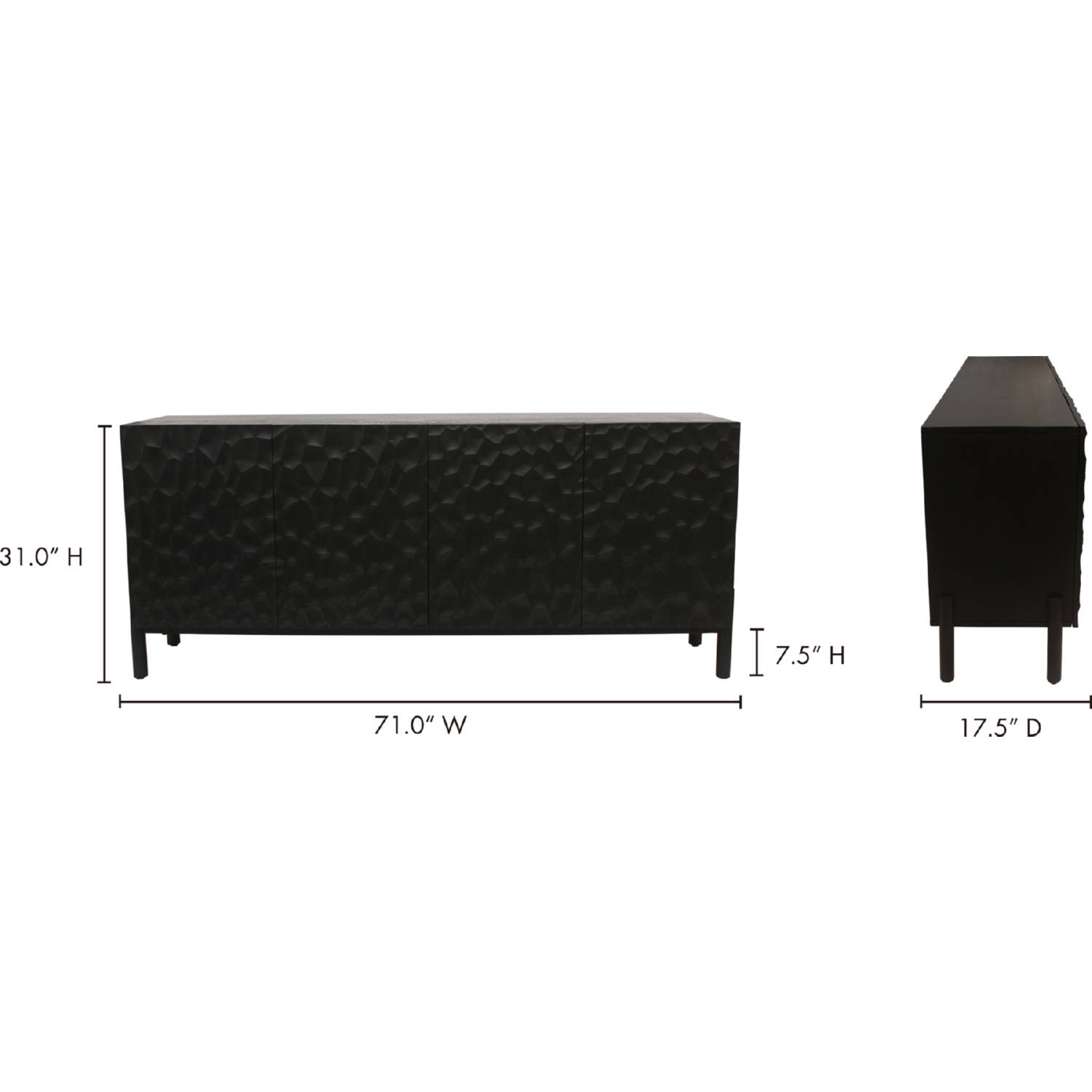 Dimensions: 71"W x 17.75"D x 31"H, Leg Height: 7.75", Interior Shelf: 34"W x 16"D x 10.75"H
