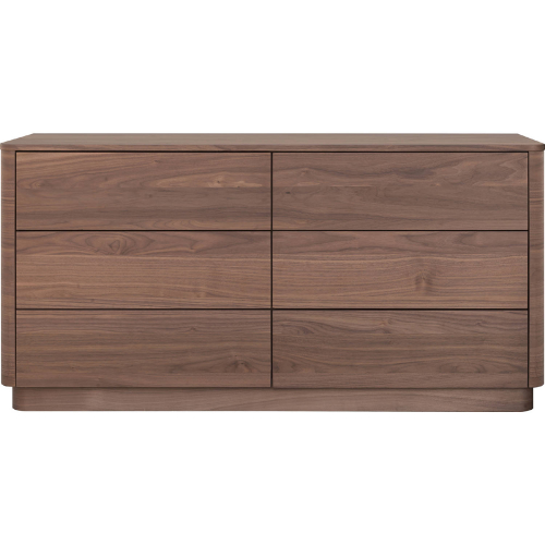 A soft, natural look for your bedroom. The Round Off collection is a showcase of walnut, with the beautiful dark tones of the grain matched to a simple, comforting design. This dresser features a low build and softly rounded corners, with plenty of room for personalized styling across its top. Six drawers glide open to reveal plentiful storage space for your favorite clothing. As part of the Round Off bedroom collection, pair with the nightstand and bed for the complete look. Natural beauty and character come together to promote mellow relaxation in the most personal room of your home.