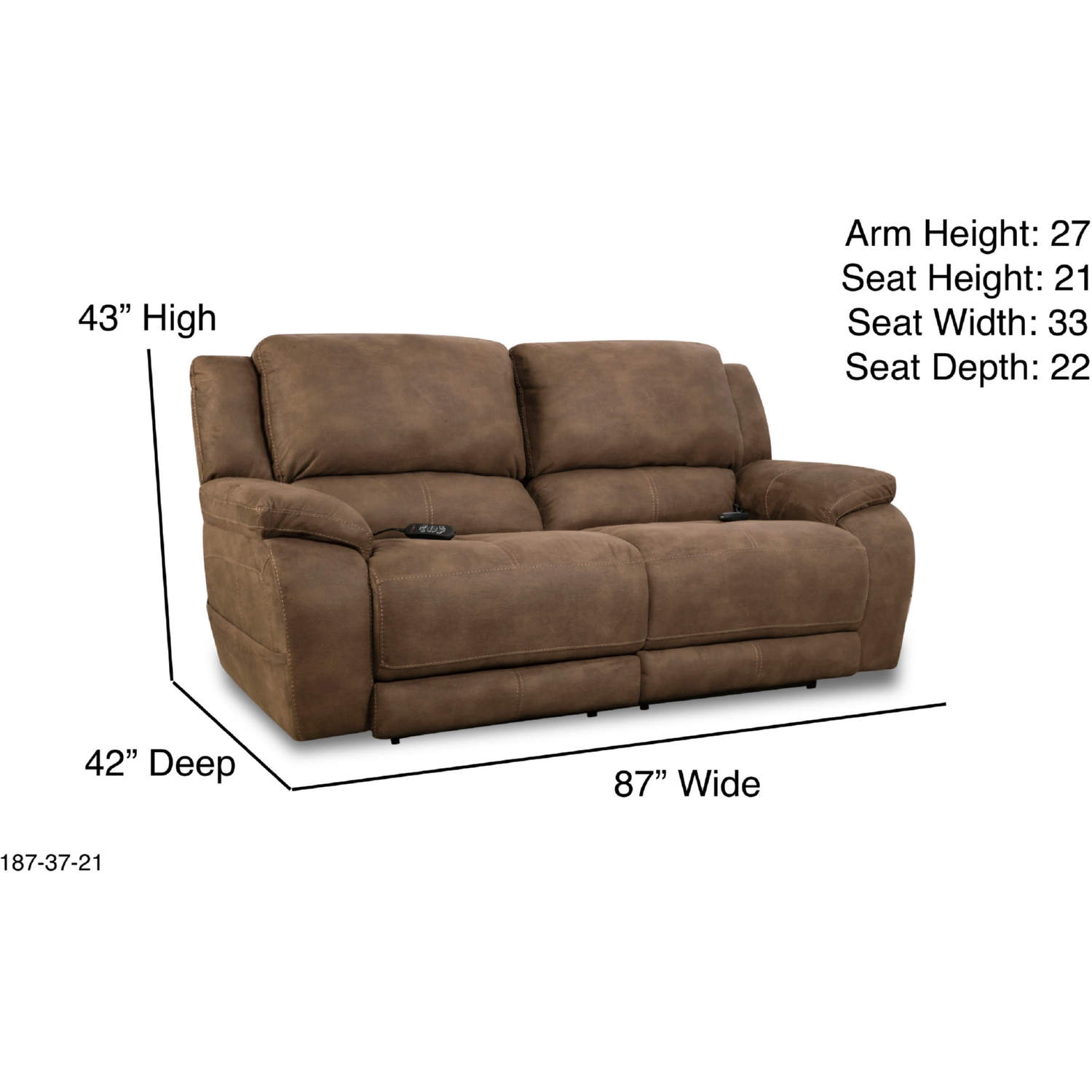 Dimensions: 87"W x 42"D x 43"H, Seat: 33"W x 22"D x 21"H, Full Recline: 73", Arm Height: 27"