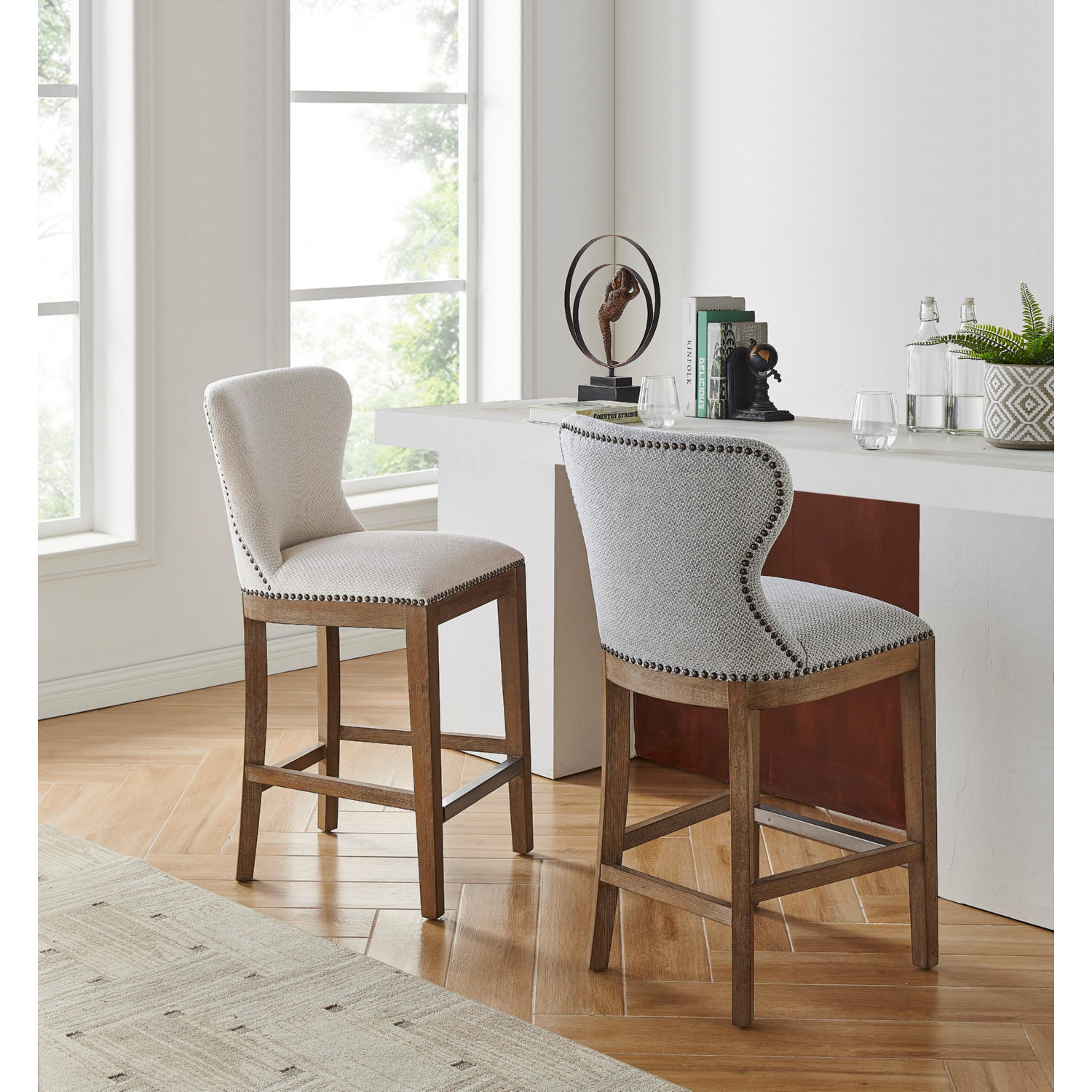 New Pacific Direct Dorsey Counter Stool in Beige Fabric & Driftwood