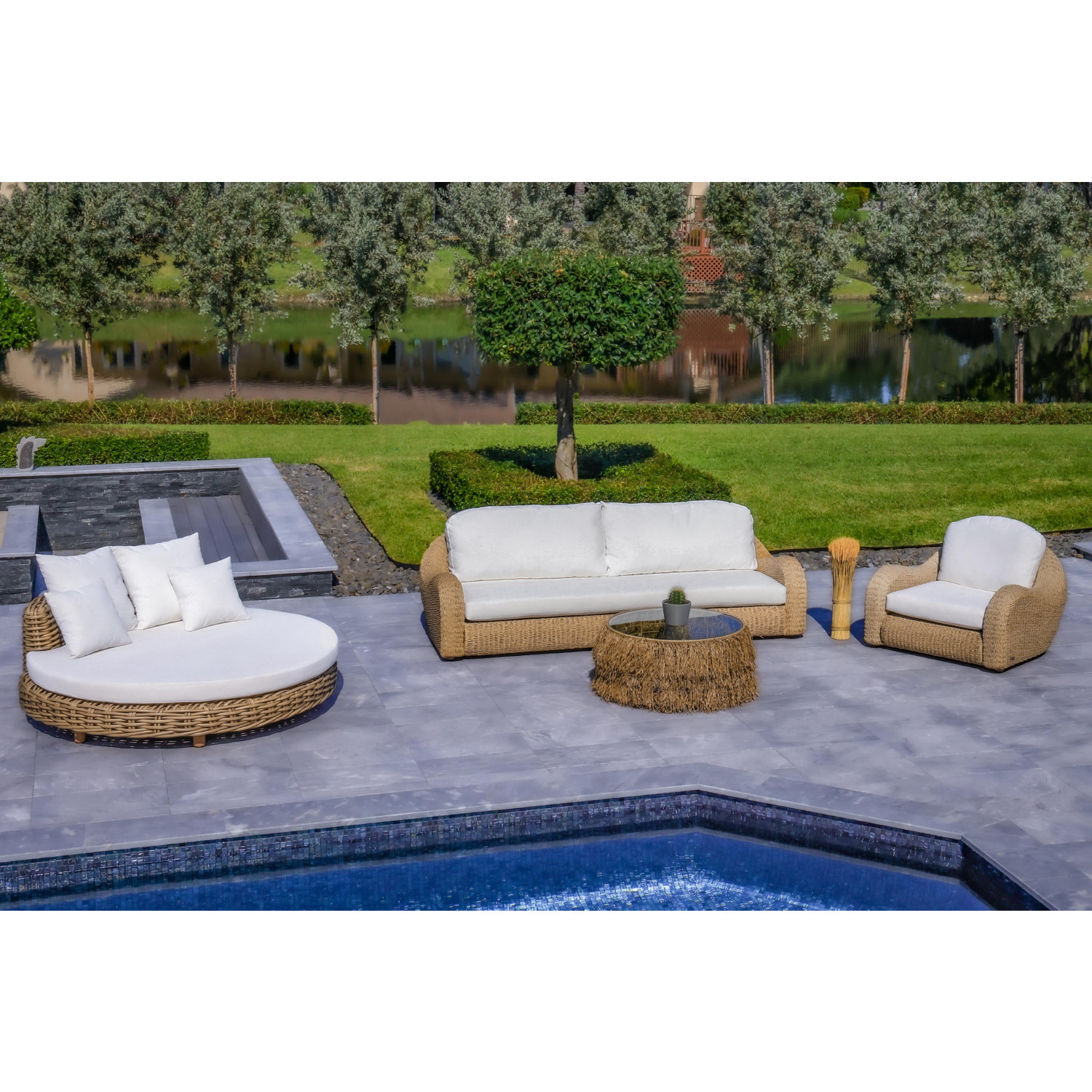 Dimensions: Sofa: 96.06"W x 42.13"D x 26.38"H, Lounge Chair: 39.76"W x 42.13"D x 26.38"H, Table: 34.45"W x 34.45"D x 15.75"H