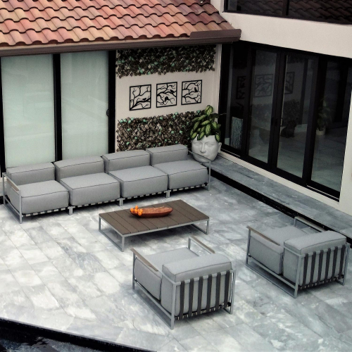 OUTSY Sunrise 7 Piece Outdoor Sofa Set in Grey Sunbrella Fabric & Stainless Steel