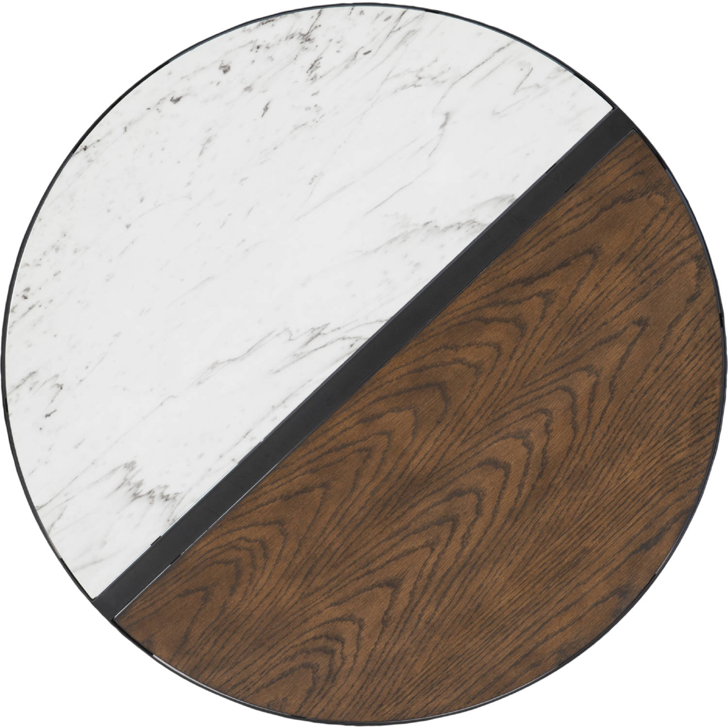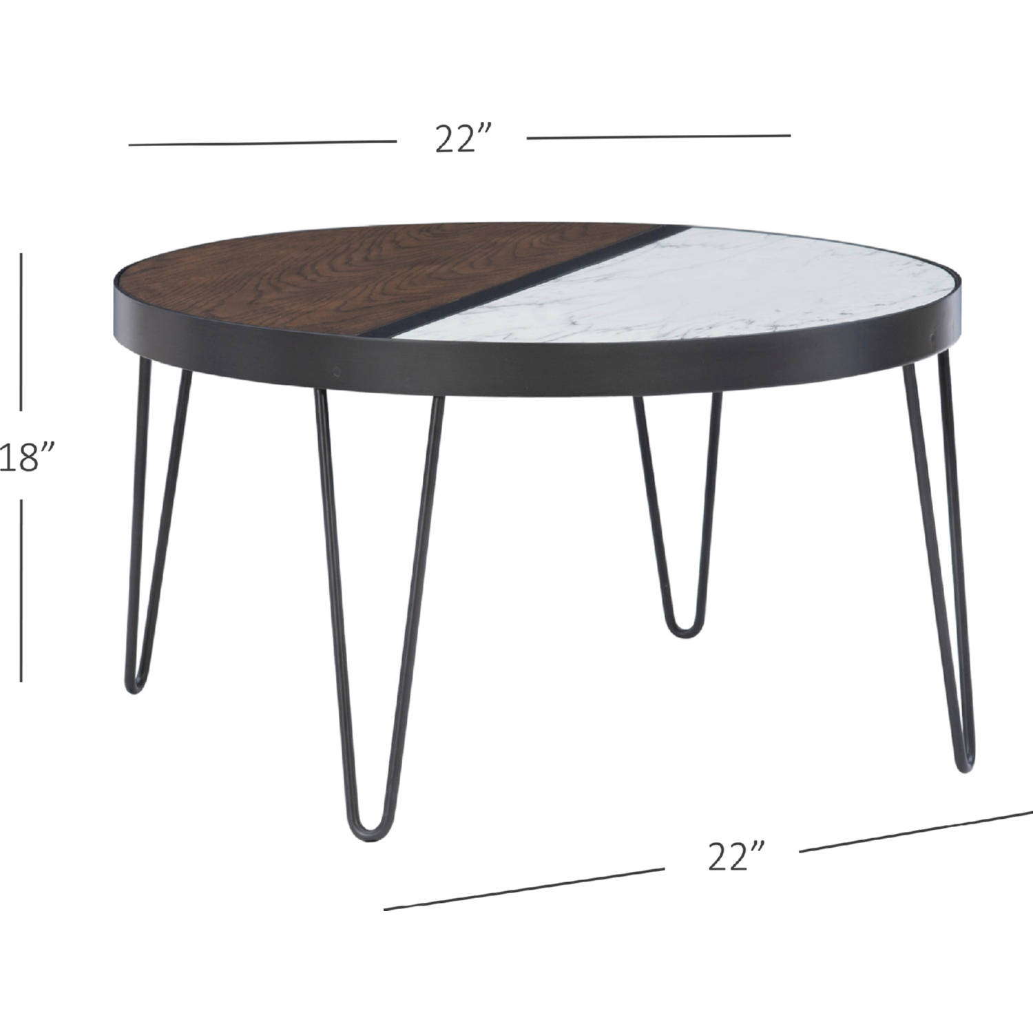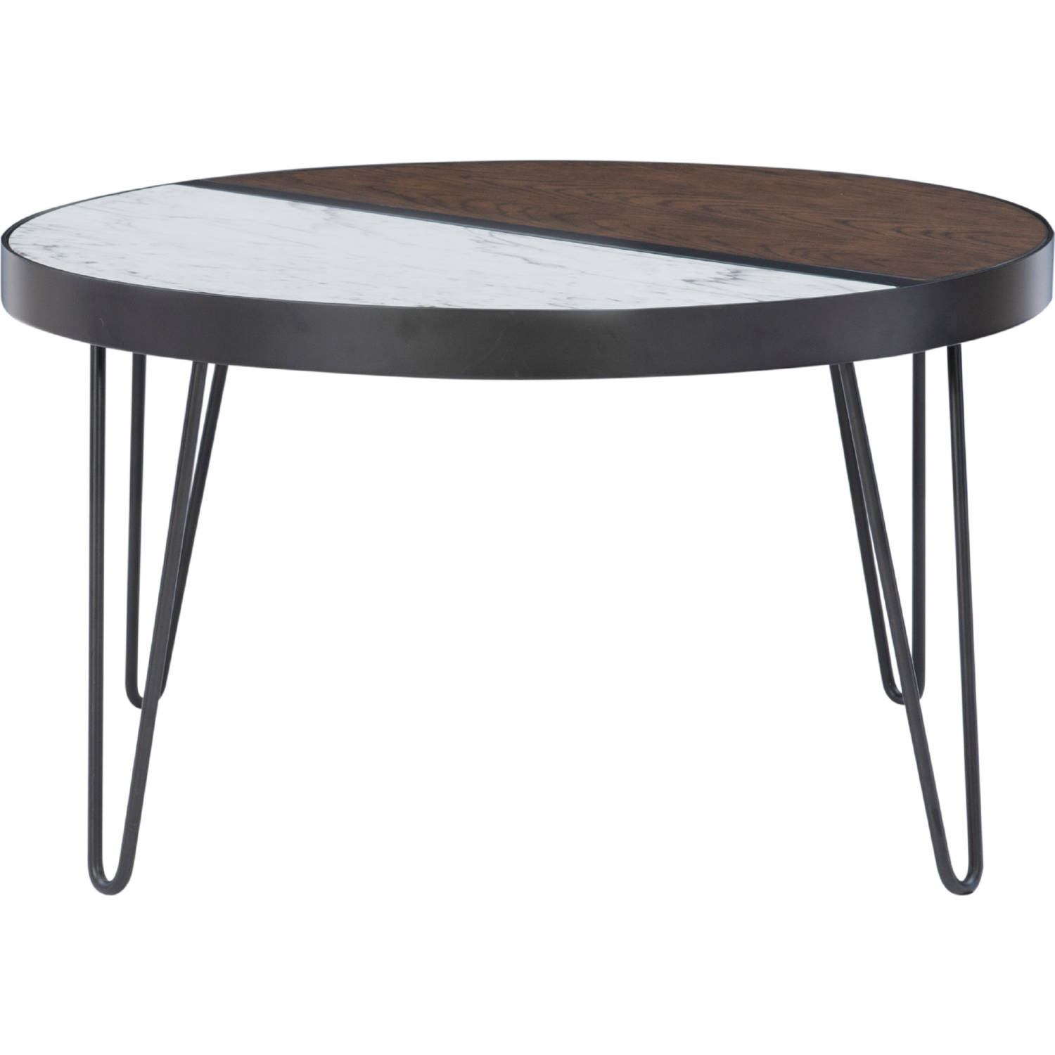 Add aesthetic appeal to your living room with this two toned coffee table. The circular shape of the top carries into hairpin legs to bring a distinctive, contemporary vibe into your dwelling. The metal base is complemented by the two toned surface that pays ode to the natural materials found in modern design with a contrasting wood and marble paper veneer. It is the perfect size to display a few special items along with open space for beverages.