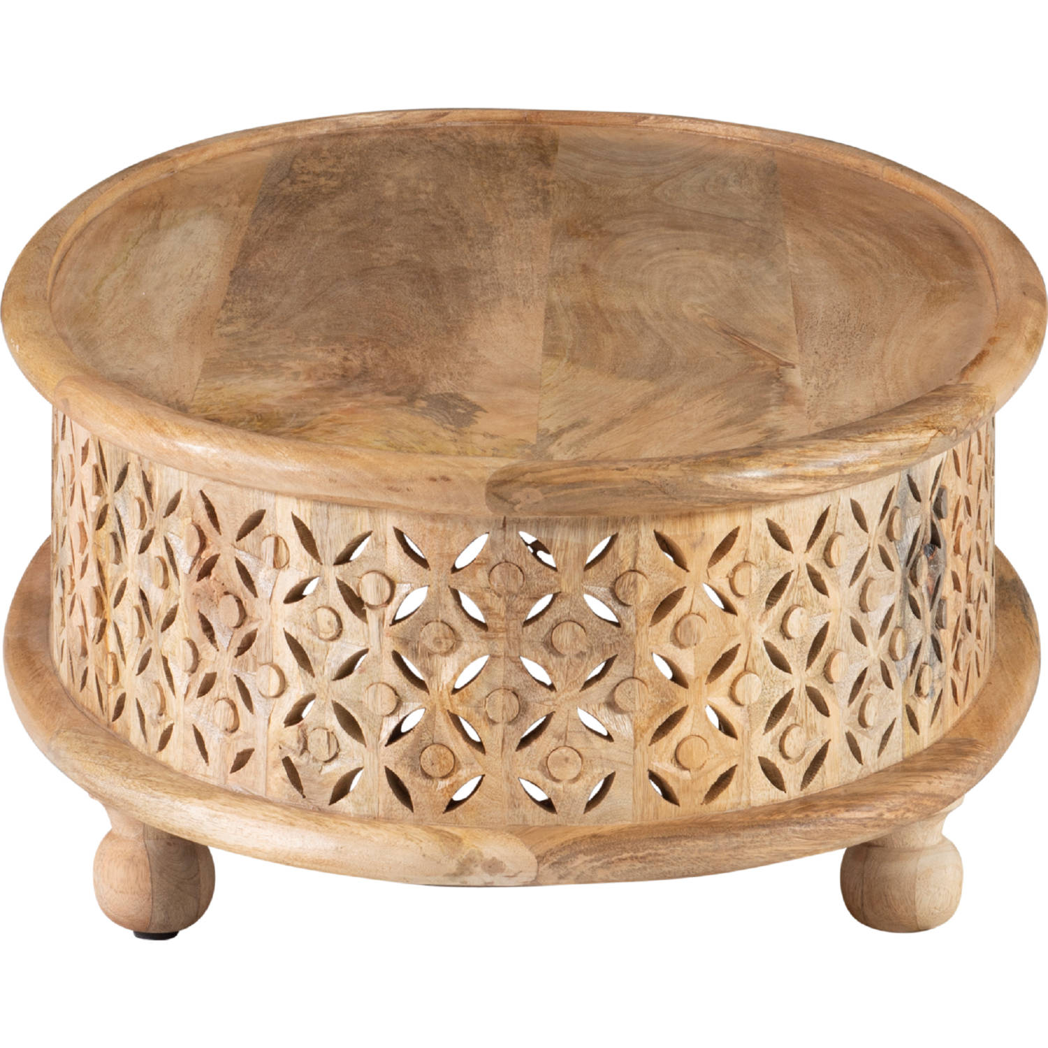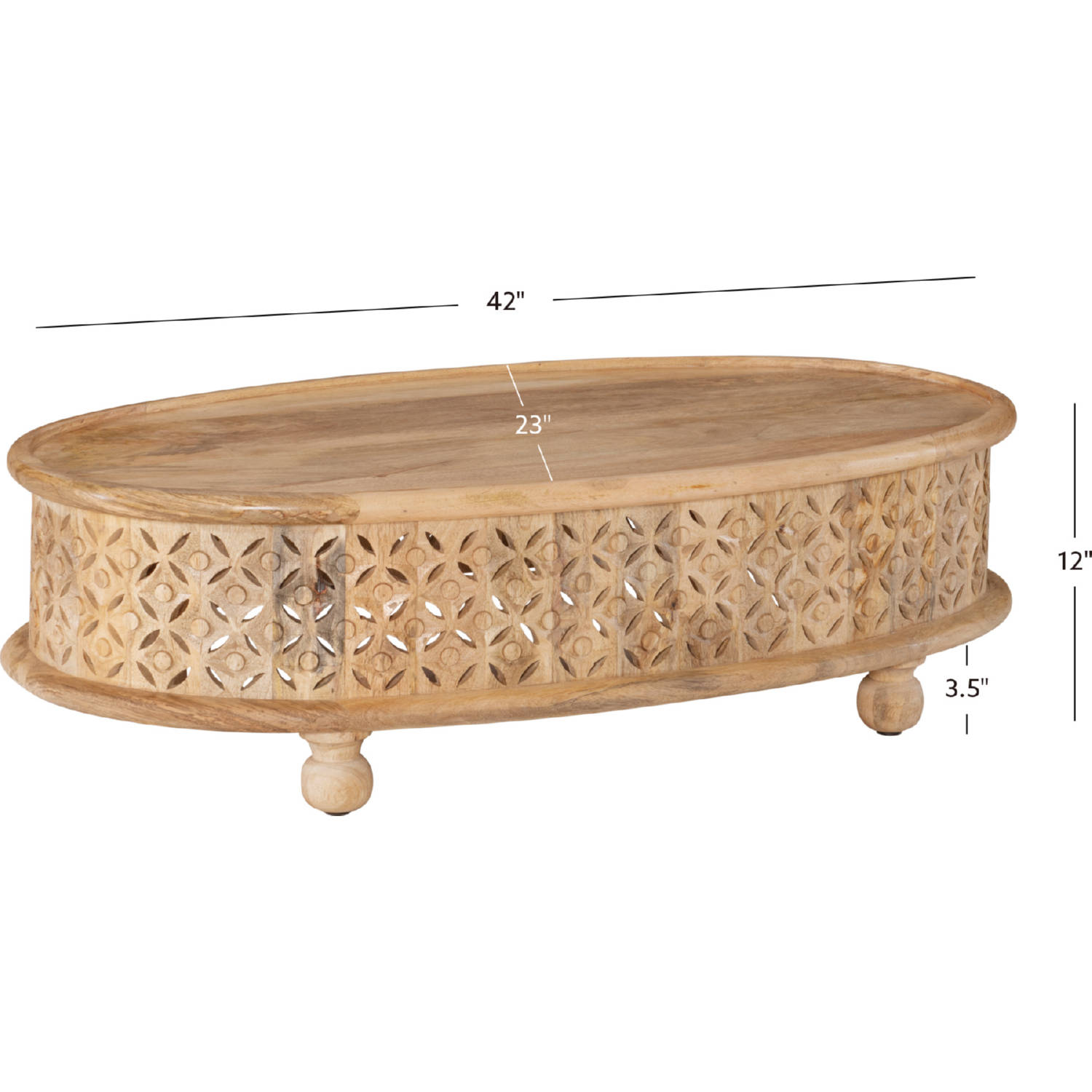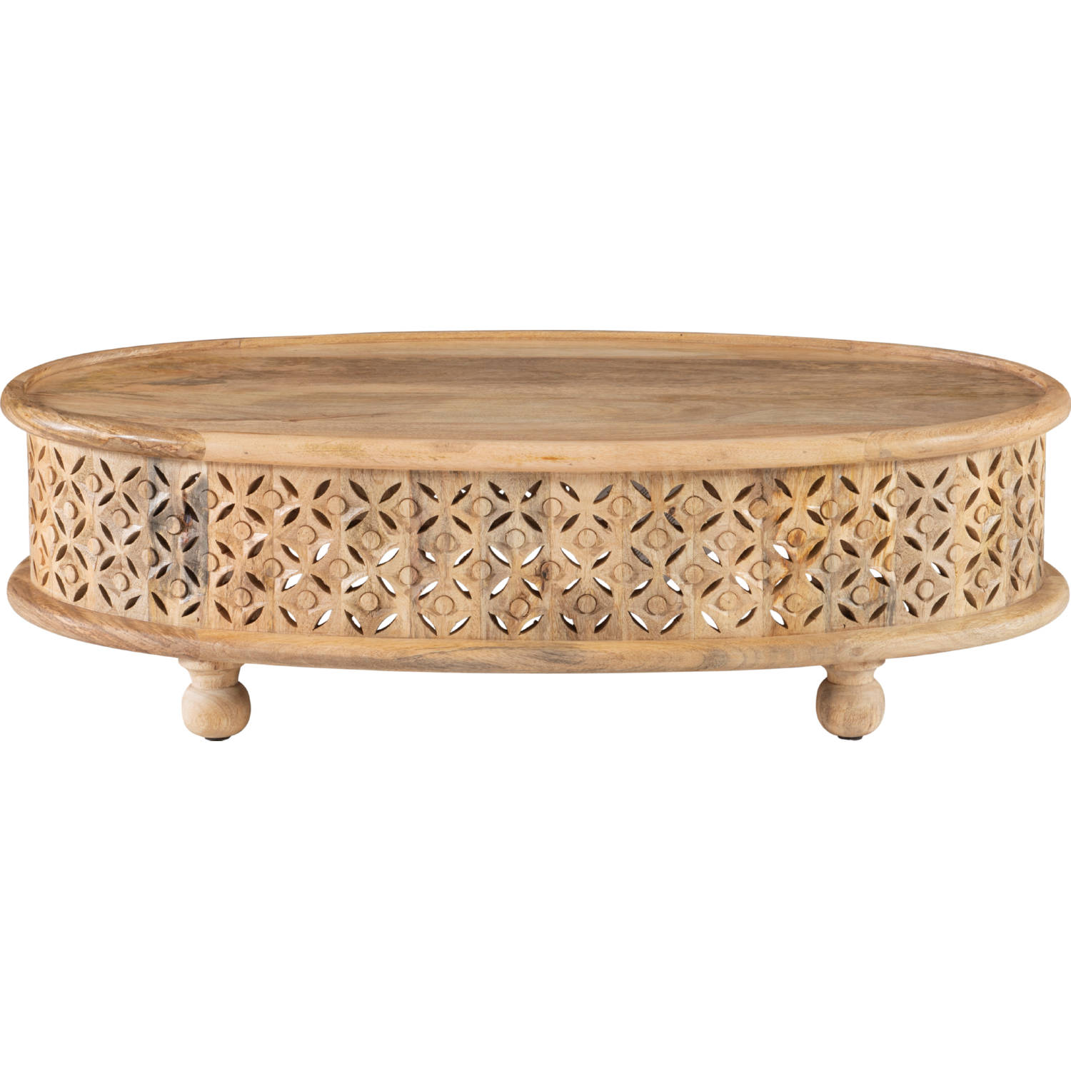 Art, color and texture come home to your space with this carved wood coffee table. The oval silhouette offers a welcome contrast to the usual angular elements of a room. The intricate, hand carved lattice pattern brings a bit of boho style to catch your eye. Made of 100 percent mango wood, this sturdy piece provides ample space to display your favorite coffee table books and set drinks. Four, spherical feet complement the oval design. Natures beauty is on display with a clear natural stain finish.