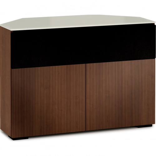 Salamander Designs Manhattan 329 Corner TV Stand AV Cabinet in Medium Walnut with Matte Taupe Glass Top