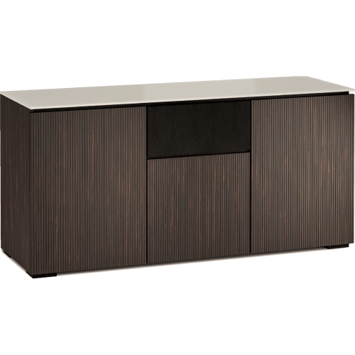 Salamander Designs Chameleon Media Cabinets in Manhattan style combine elegance with the strength of a unique, robust C-frame aluminum chassis and is made in the USA in our factory. Our expertly crafted panels attach to this durable frame, offering endless customization to match your taste, electronics and needs. While these Cabinets look like luxury furniture, they also provide unmatched versatility with bolt-on entertainment options and accessories - designed specifically for you. Crafted with meticulous attention to detail, the Manhattan Media Cabinet features a vertical, stripe textured pattern in an Ebony Maro finish with a soft matte taupe, etched glass top with a non-reflective surface.