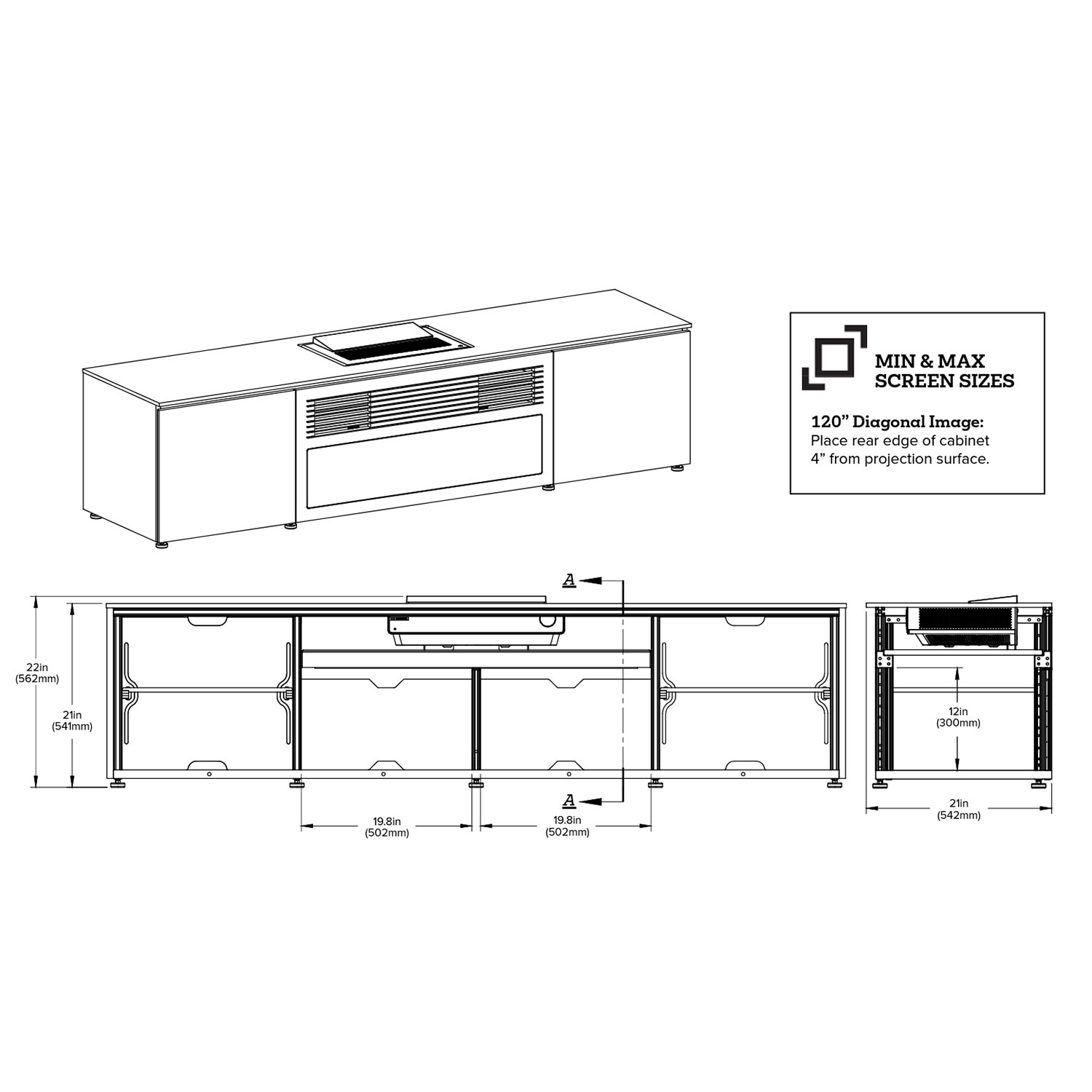 • Max screen size: 120" Diagonal Image: Place rear edge of cabinet 4" from projection surface