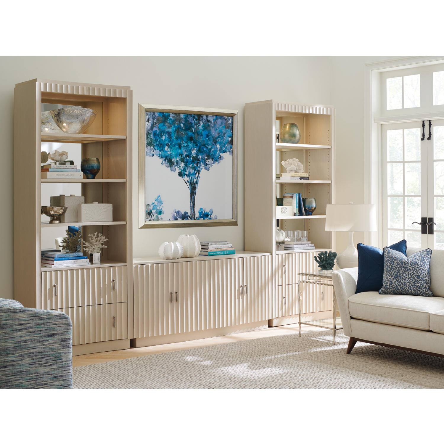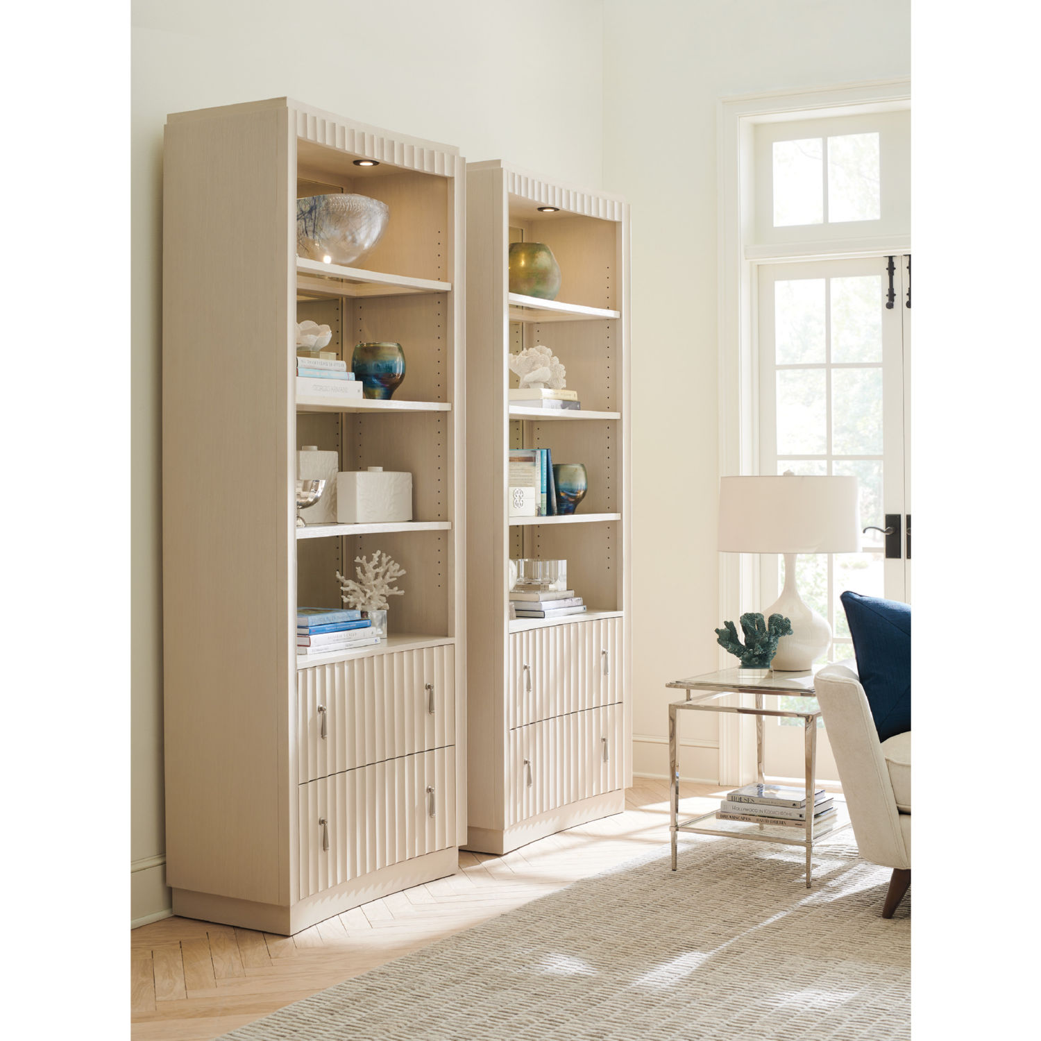 The Walden bookcase features a gentle concave front, three wood-framed adjustable glass shelves, and touch LED lighting. In the lower section, two full-extension file drawers accommodate both letter and legal files. The cabinets may flank the bowfront Ellerston media console for a beautiful look. The cabinets also pair with the larger San Marcos media console.