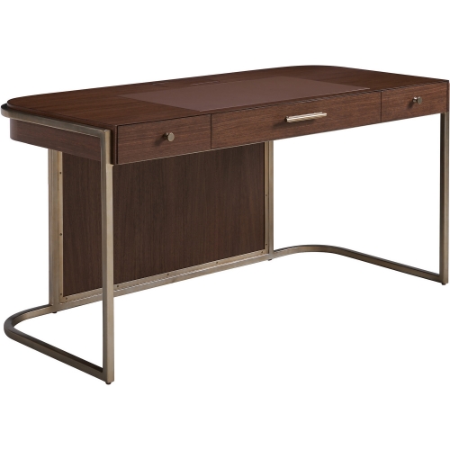 Contemporary designs crafted from quartered walnut veneers and select hardwoods in a dark walnut finish. Features include a metal base in a warm silver leaf finish, modesty panel, Brisa leather writing surface, and three full-extension storage drawers. The touch latch center top reveals two plug power supply with two USB charging jacks.