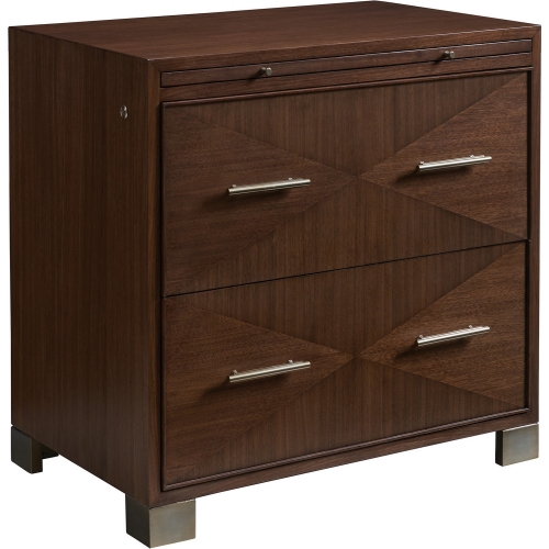 Contemporary designs crafted from quartered walnut veneers and select hardwoods in a dark walnut finish. The two full extension locking file drawers accommodate legal and letter size files, with a pull-out shelf for additional work surface, and metal block feet in a warm silver leaf finish.