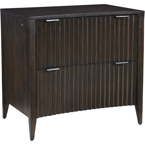 Transitional designs crafted from quartered oak veneers and select hardwoods in a dark walnut finish and custom hardware in a pewter finish. The two locking full-extension file drawers accommodate legal and or letter size files. The soft concave shape is highlighted with undulating drawer fronts.