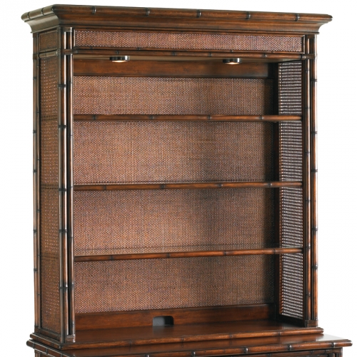 The three wood framed glass shelves are illuminated by touch controlled lighting set above. With woven rattan back and beautiful cane end panels, this deck provides both ventilation and cord management.