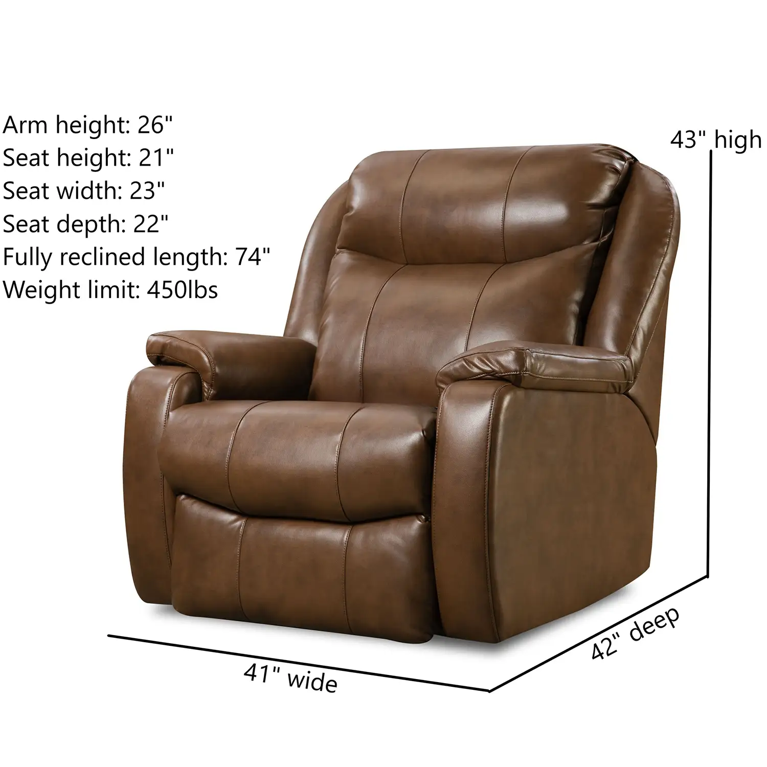 Dimensions: 41"W x 42"D x 43"H, Seat: 23"W x 22"D x 21"H, Arm Height: 26", Full recline length: 74"