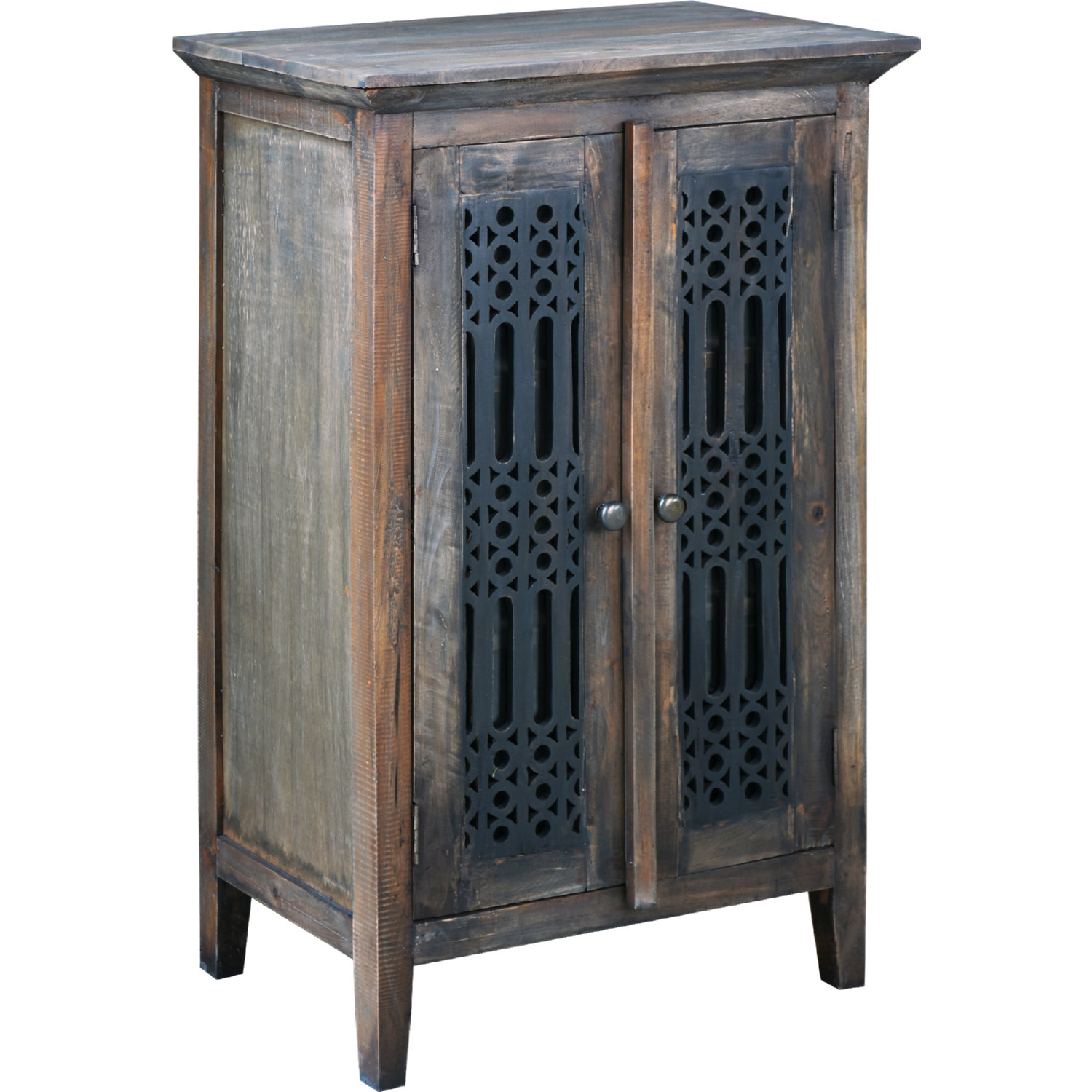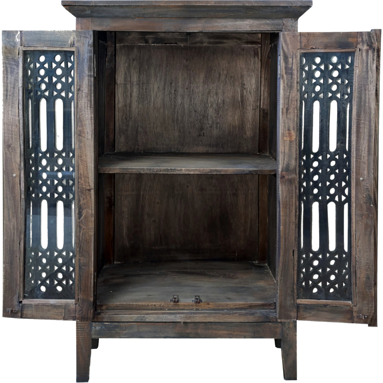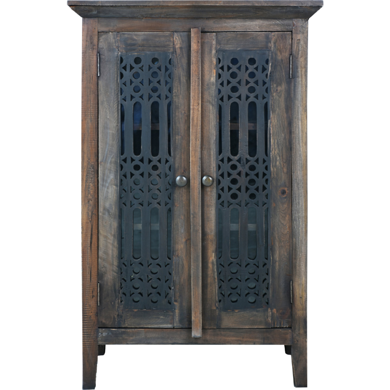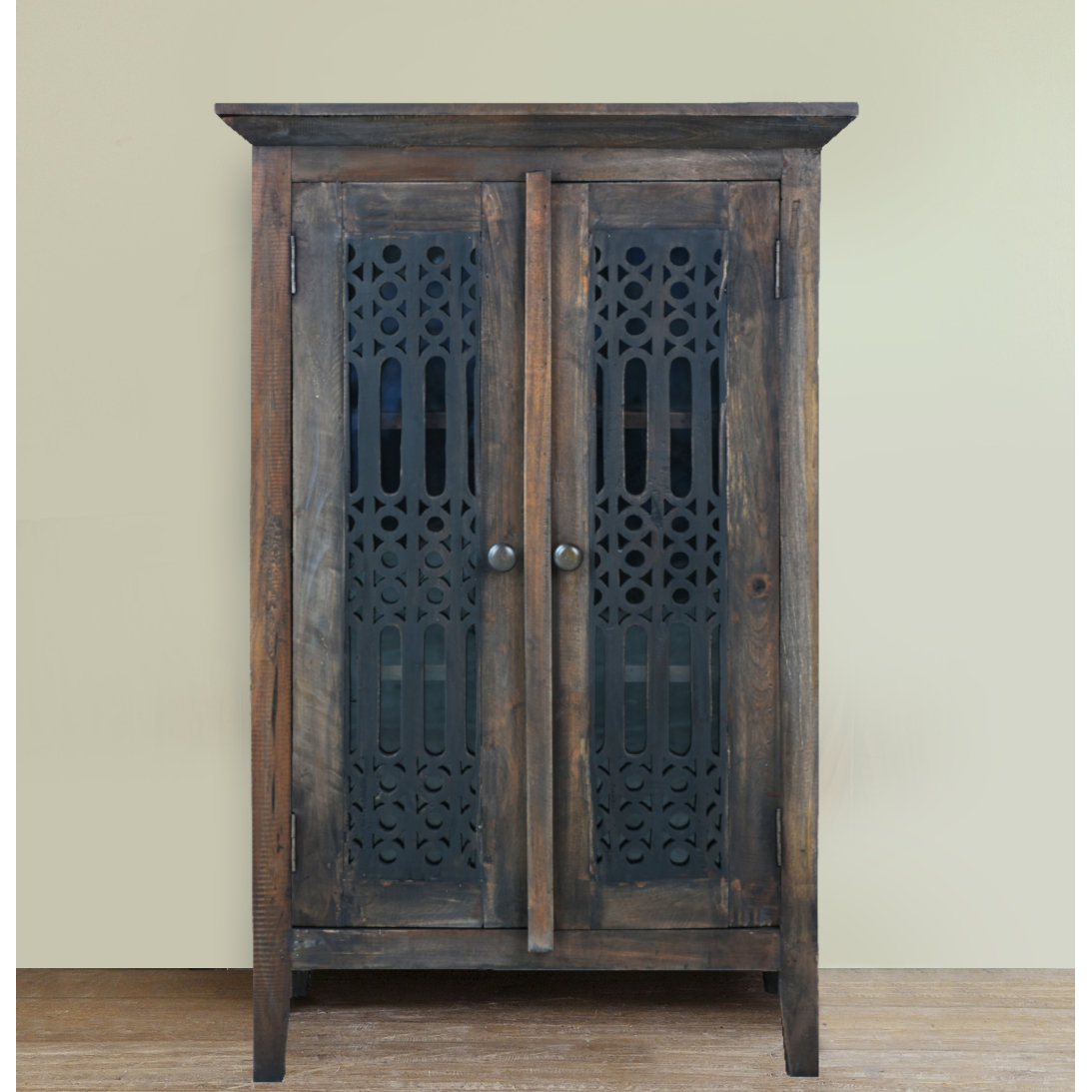 • Distressed raftwood brown with vintage black wood lattice door fronts allude rustic country cottage charm
