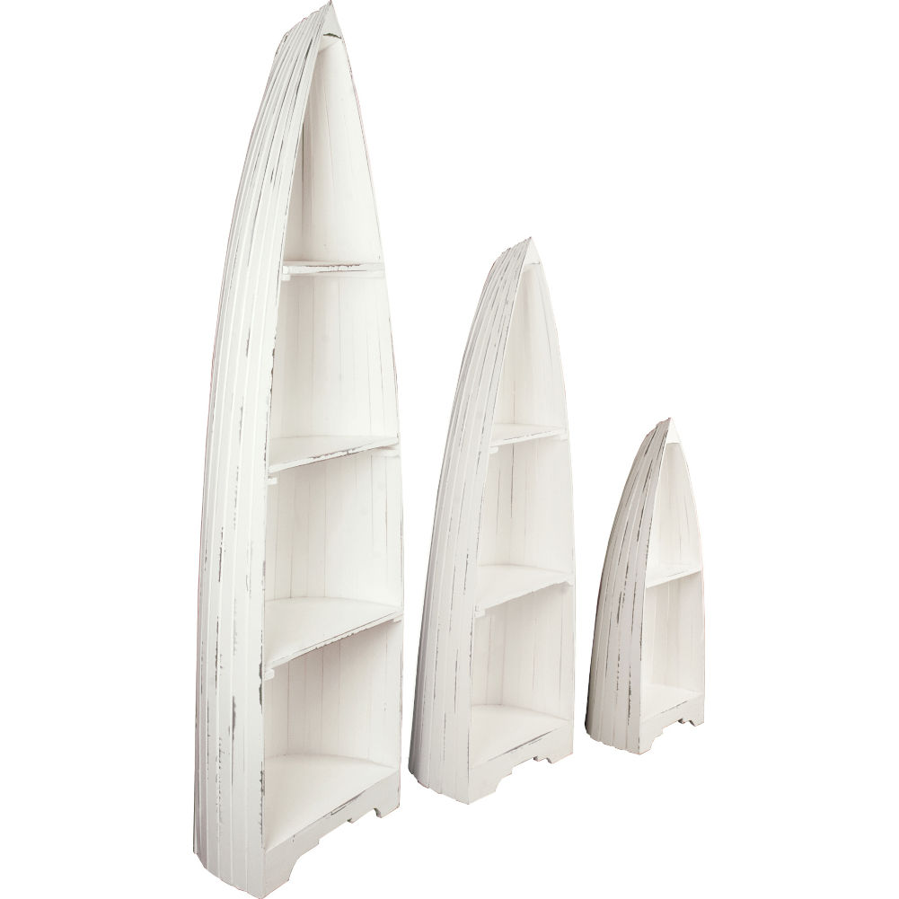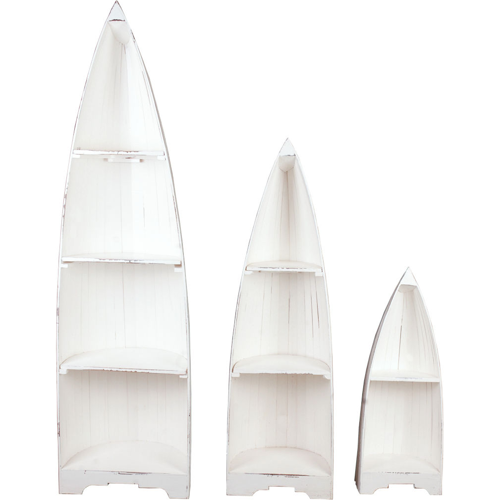 Dimensions: Large boat: 77"H x 13.5"D x 21.5"W, Large boat shelves: Top: 20.25"H x 9.75"D x 14"W, Top middle: 15.5"H x 11"D x 18.25"W, Bottom middle: 15.75"H x 12.25"D x 20.5"W, Bottom: 15.5"H x 13"D x 20.75"W, Medium boat: 57.25"H x 11.5"D x 17.75"W, Medium boat shelves: Top: 18"H x 9"D x 11.75"W, Middle: 15.5"H x 10.75"D x 16.5"W, Bottom: 14.25"H x 11"D x 17"W, Small boat: 37.25"H x 10.5"D x 14.25"W, Small boat shelves: Top: 17"H x 8"D x 12"W, Bottom: 13.25"H x 10"D x 13.5"W, Carved baseboards: Large and medium boats: 4"H, Small boat: 3.75"H, Space under each unit: Large 1.5"H, Medium 1.5"H, Small 1.25"H