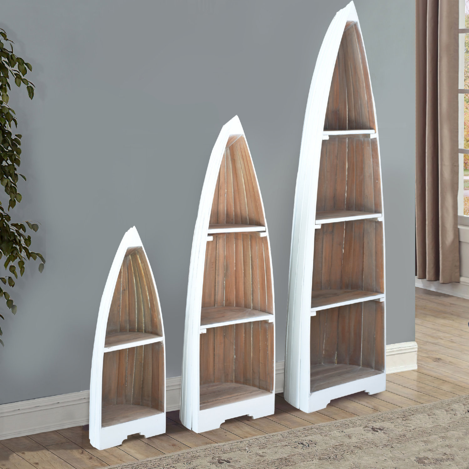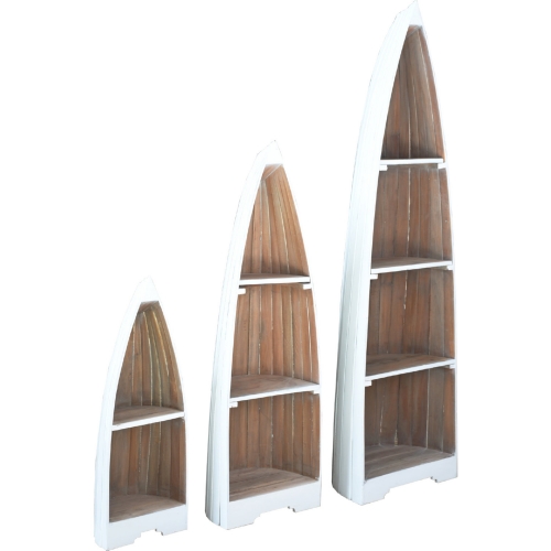 Dimensions: Large boat: 77"H x 13"D x 21"W, Shelves: Top: 20"H x 10"D x 14"W, Top middle: 15"H x 11"D x 18"W, Bottom middle: 16"H x 12"D x 20"W, Bottom: 15"H x 13"D x 21"W, Medium boat: 57"H x 11"D x 18"W, Shelves: Top: 18"H x 9"D x 12"W, Middle: 15"H x 11"D x 16"W, Bottom: 14"H x 11"D x 17"W, Small boat: 37"H x 10"D x 14"W, Shelves: Top: 17"H x 8"D x 12"W, Bottom: 13"H x 10"D x 13"W, Carved baseboards: 4"H, Space under each unit: 1"