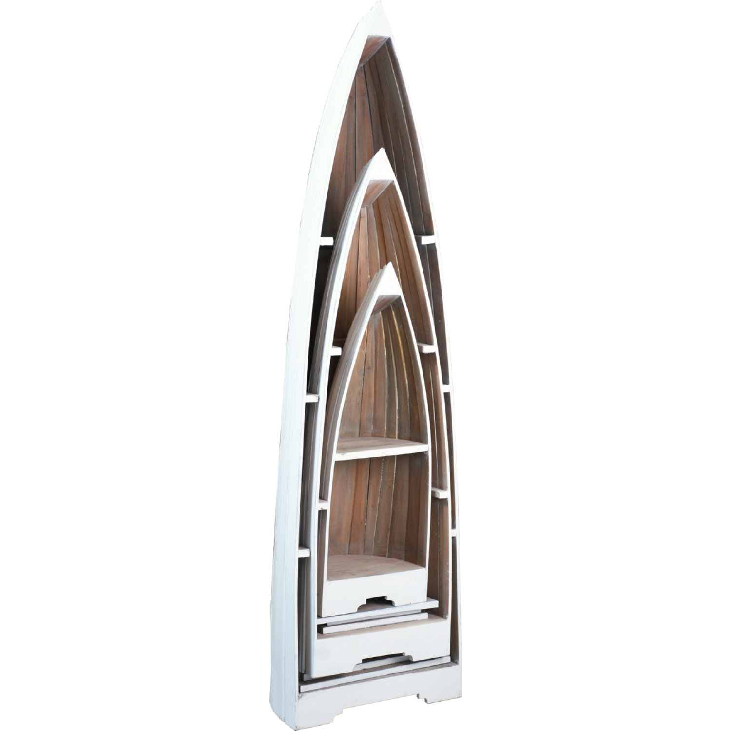 • Set includes three fully assembled solid Mahogany wood boat shaped shelving units