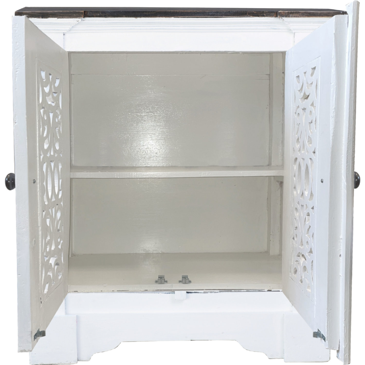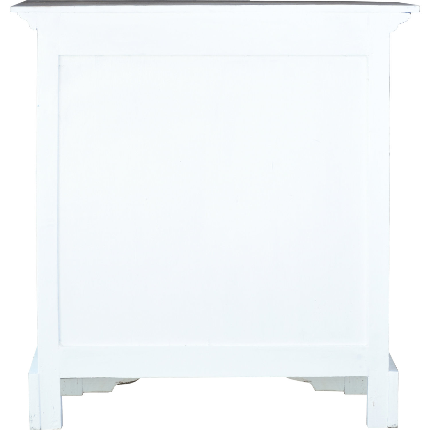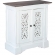 • Distressed white finish with contrasting dark wood top will add tranquility wherever it lives in your home