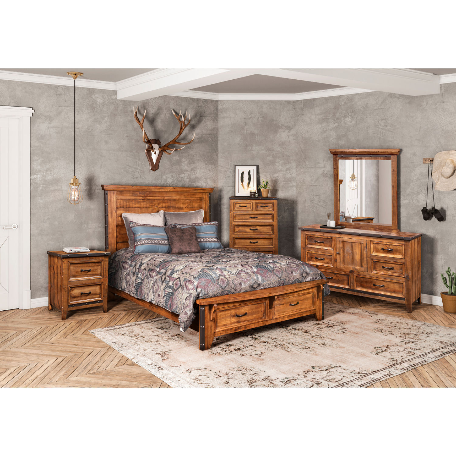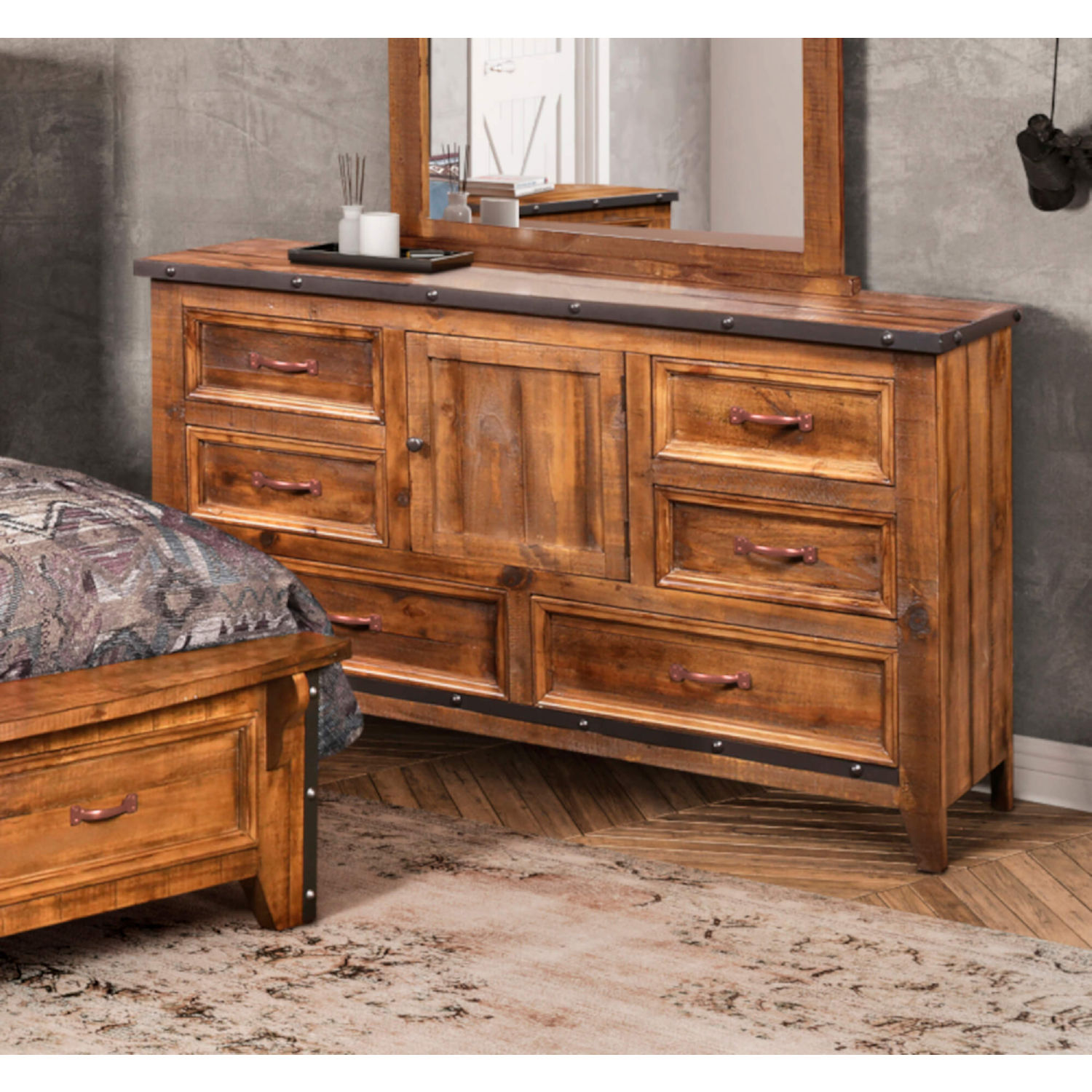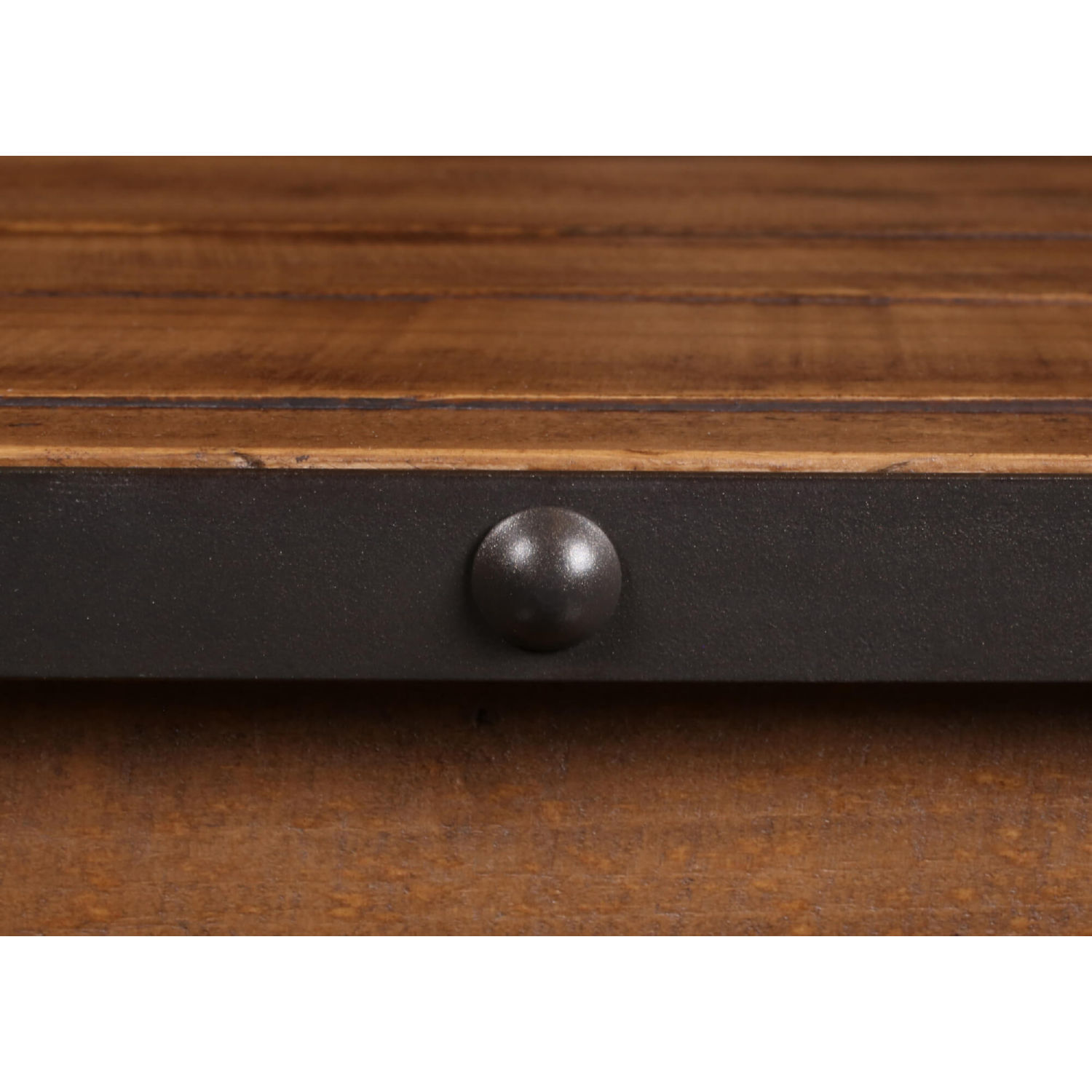 • Industrial inspired dresser top carries the same distressed planked design as front and sides