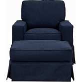 Dimensions: Chair: 39"W x 39"D x 36"H, Seat cushion: 6"H, Back cushion: 22"H x 5"D x 30"W, Back (not separate cover): 28"H x 2"D x 30"W, Arms: 24"H x 38"D x 7"W, Skirt length: 11.5"H, Seat to top of back (without cushions): 21"H x 30"W, Arms to seat (without cushions): 15"H x 33"D, Ottoman: 18"H x 25"D x 33"W, Attached pillow top: 6"H, Skirt length: 9"