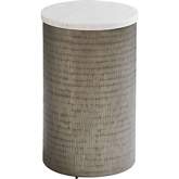 The 14" diameter Rockville martini table features a gracefully twisted metal base in aged pewter and a white veneered Santa Cruz marble top in a leathered finish.