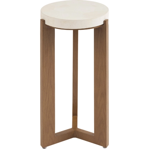 The 12" diameter accent table features a triangular metal base that is hand finished to emulate natural teak. The inset top is White Agate stone with a protective sealer.