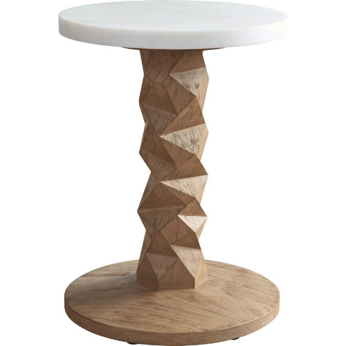 The accent table features a contemporary faceted post design on the base and a White Agate stone top with protective sealer.