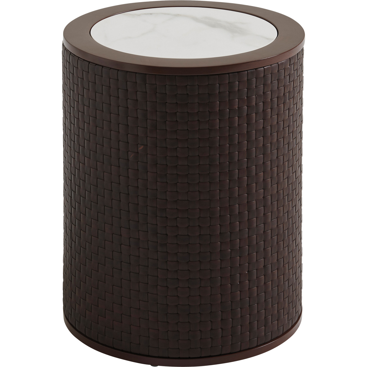The round accent table offers a soft contemporary design with a flat woven all weather wicker finished to replicate the rich tones of leather. The 18" diameter accent table blends woven wicker with a thick sintered stone top. The contrast of materials and colors makes for a striking presentation.