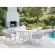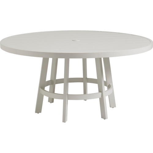 The 60.25" round dining table offers a transitional design featuring a soft oyster white finish on an aluminum frame. It has an access port in the center for an umbrella, with a Tommy Bahama monogrammed insert when an umbrella is not in use.