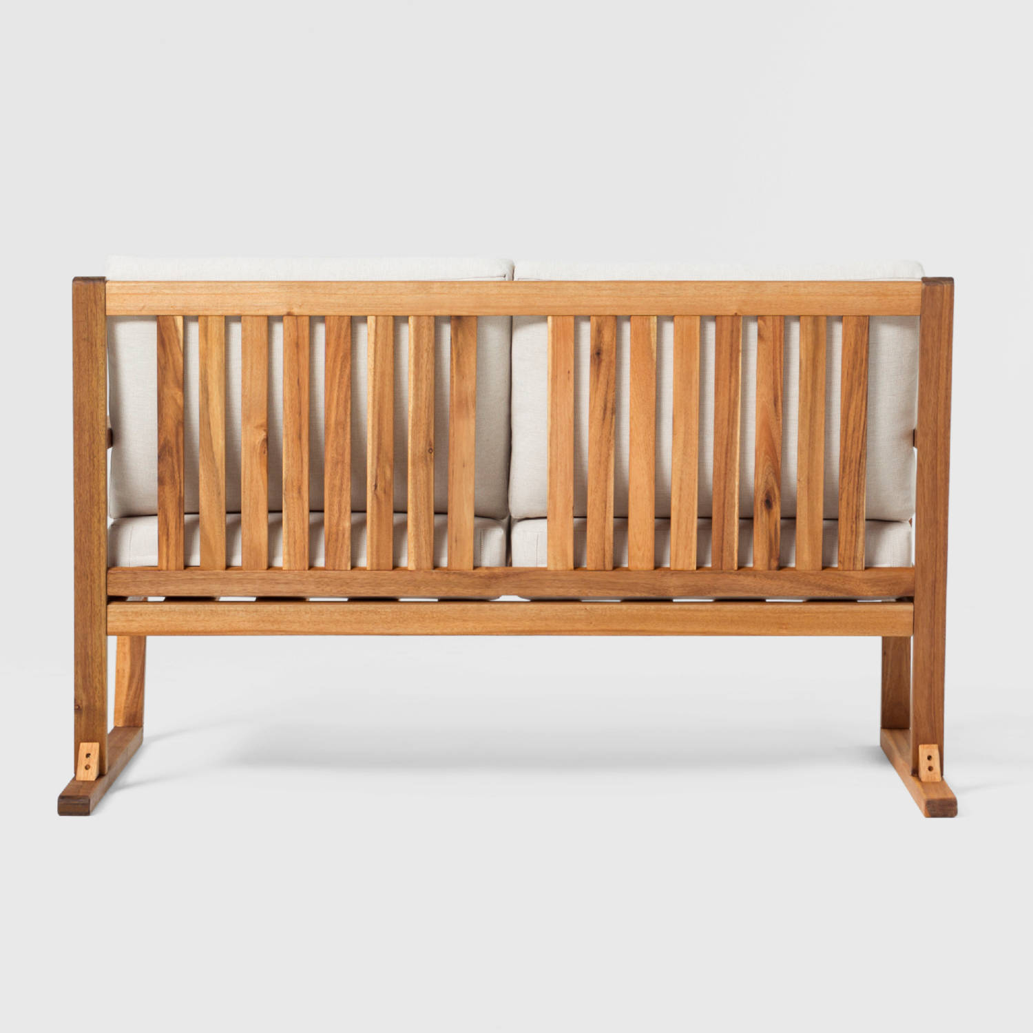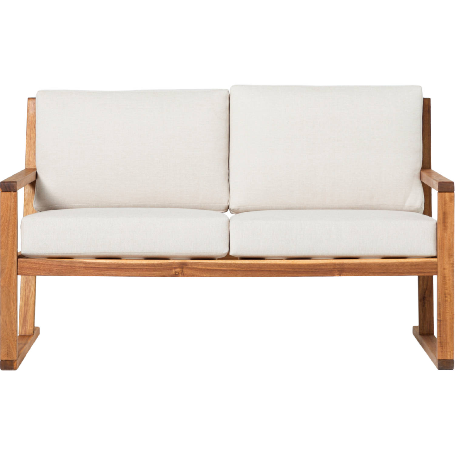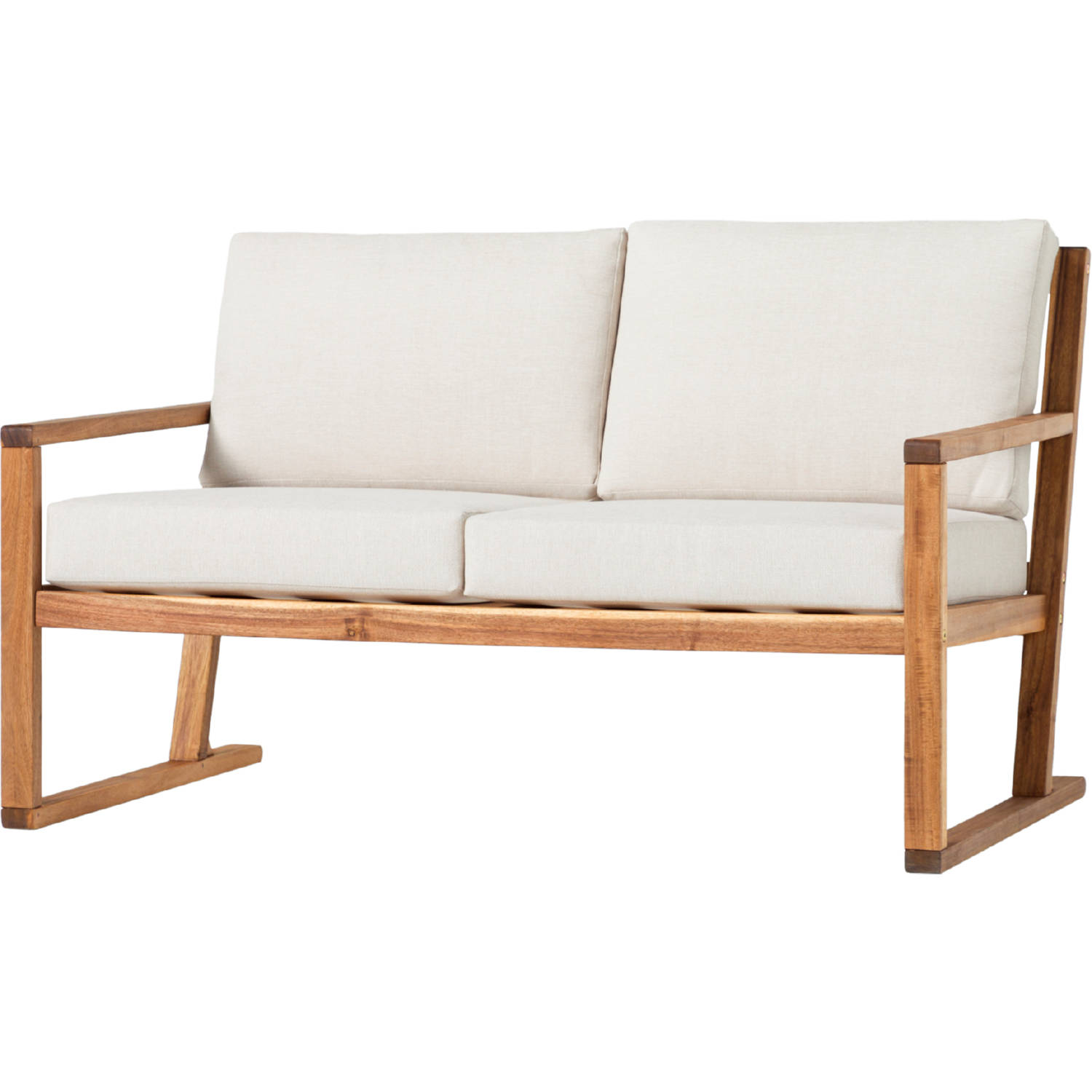 Walker Edison Prenton Outdoor Slat Back Loveseat in Natural Finish Wood & Neutral Fabric