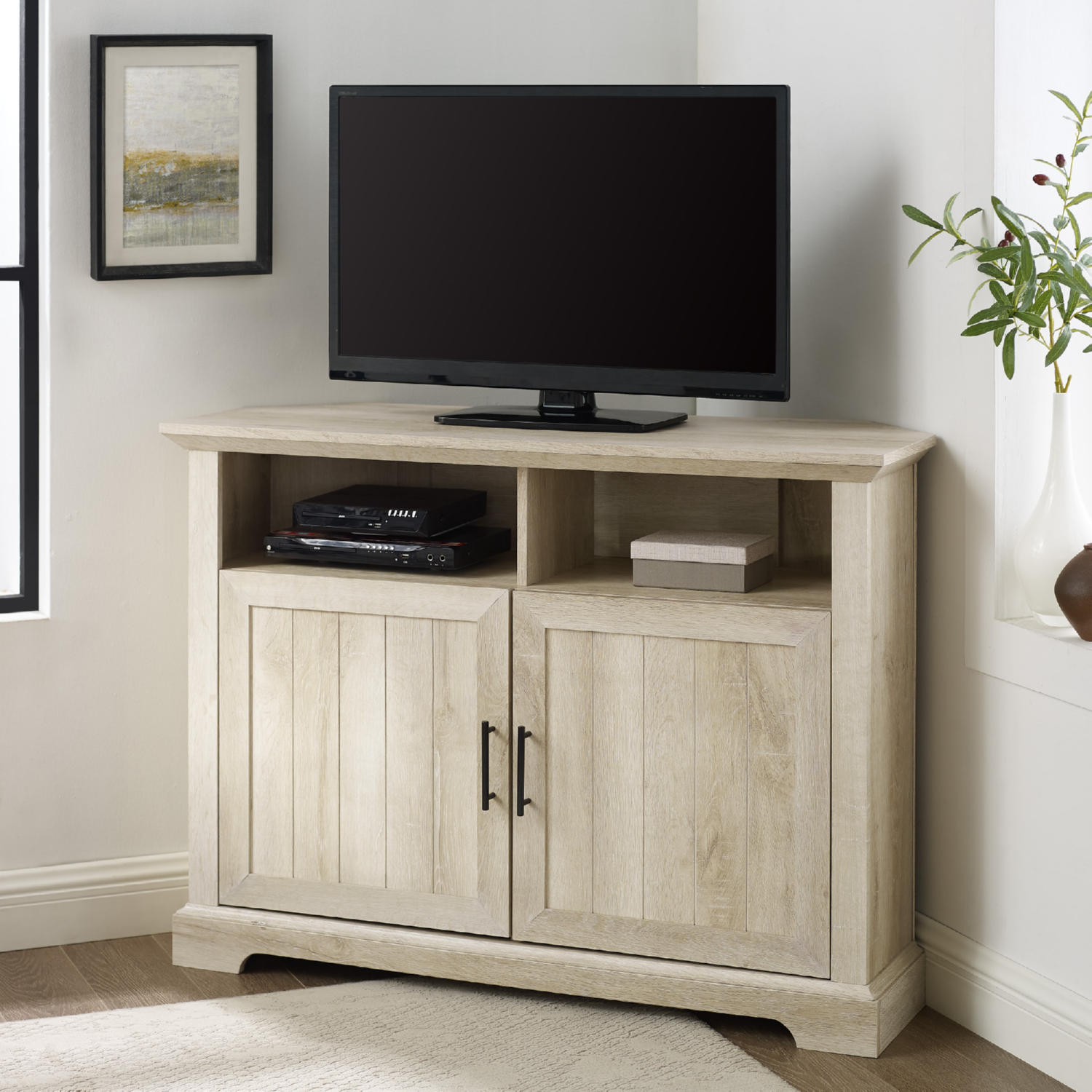Walker Edison W44CMCR2DWO 44" Grooved Door Corner TV Stand Console White Oak Finish