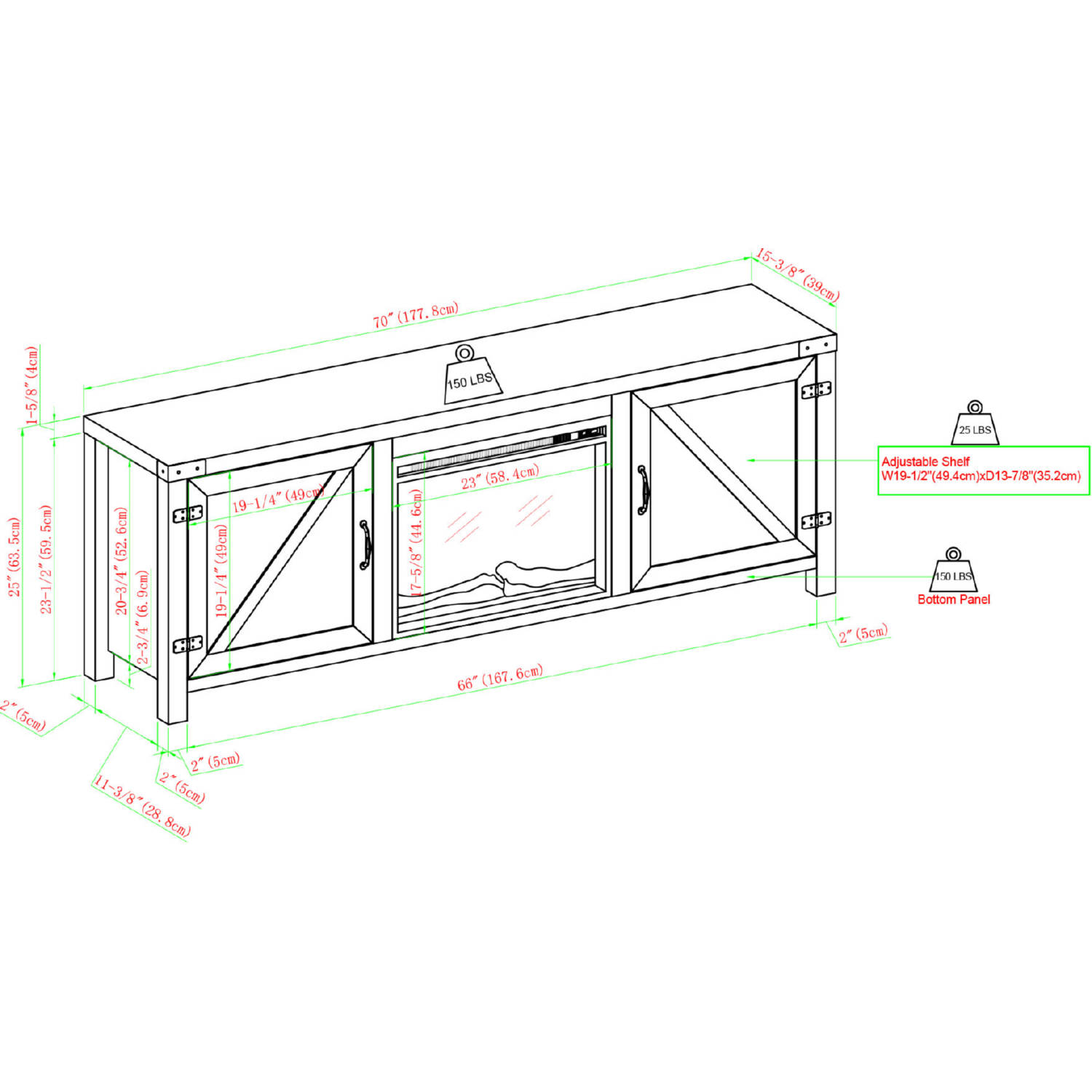 Dimensions: 70"W x 15.5"D x 25"H, Top Thickness: 1.5", Leg Height: 2.75", Adjustable Shelves: 19.5"W x 13.75"D, Inner Cabinet: 19.5"W x 13.75"D x 19.25"H